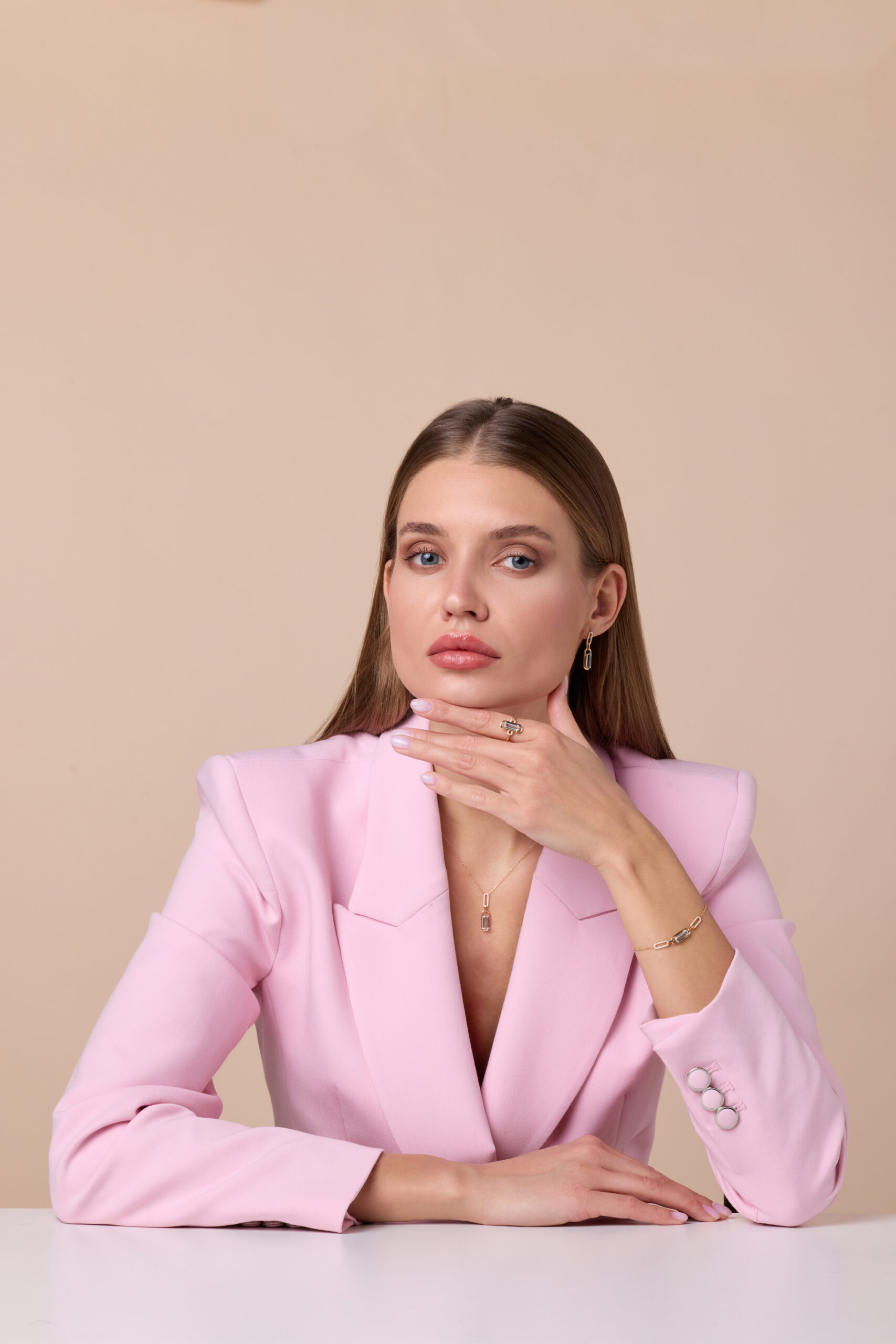 Blue topaz glistens beneath a cascade of diamonds, set in yellow gold, a radiant expression of serenity, brilliance, and graceful confidence.