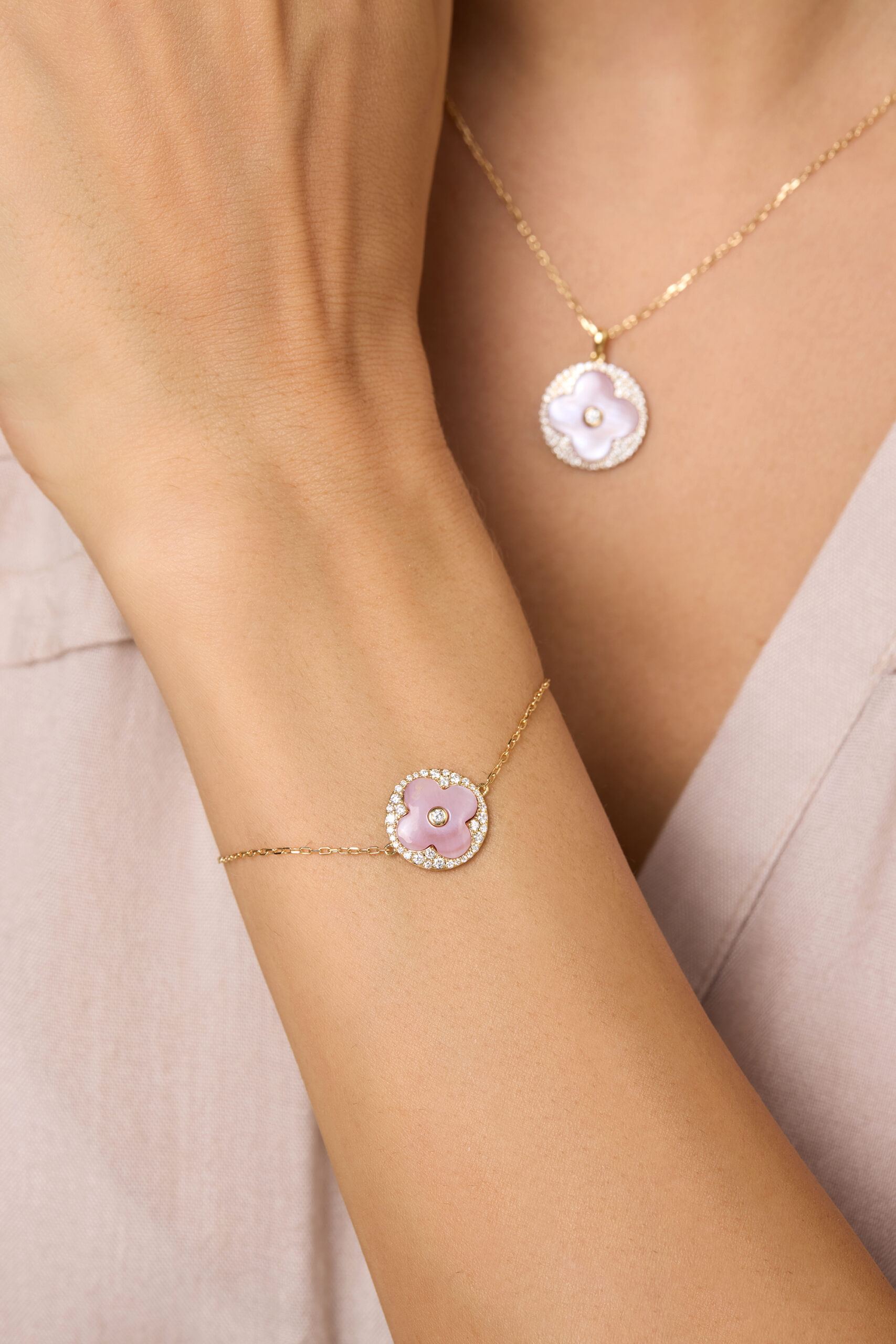A pink mother of pearl blossom, framed in yellow gold and lit with diamonds radiating unity, faith, and timeless feminine elegance