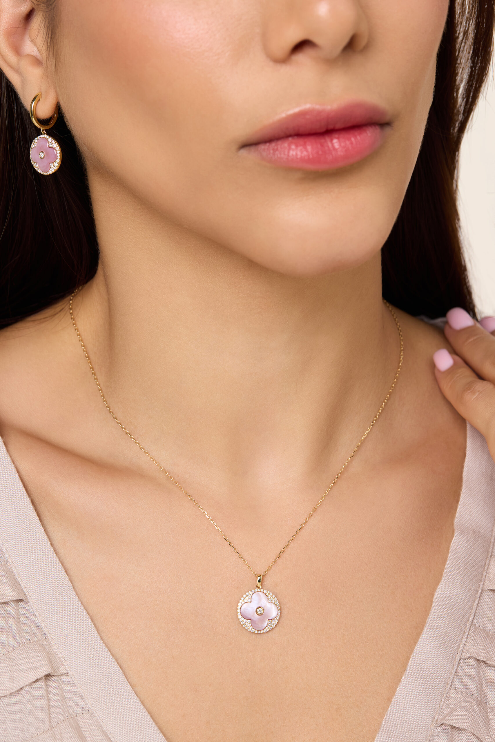 A pink mother of pearl blossom, framed in yellow gold and lit with diamonds radiating unity, faith, and timeless feminine elegance