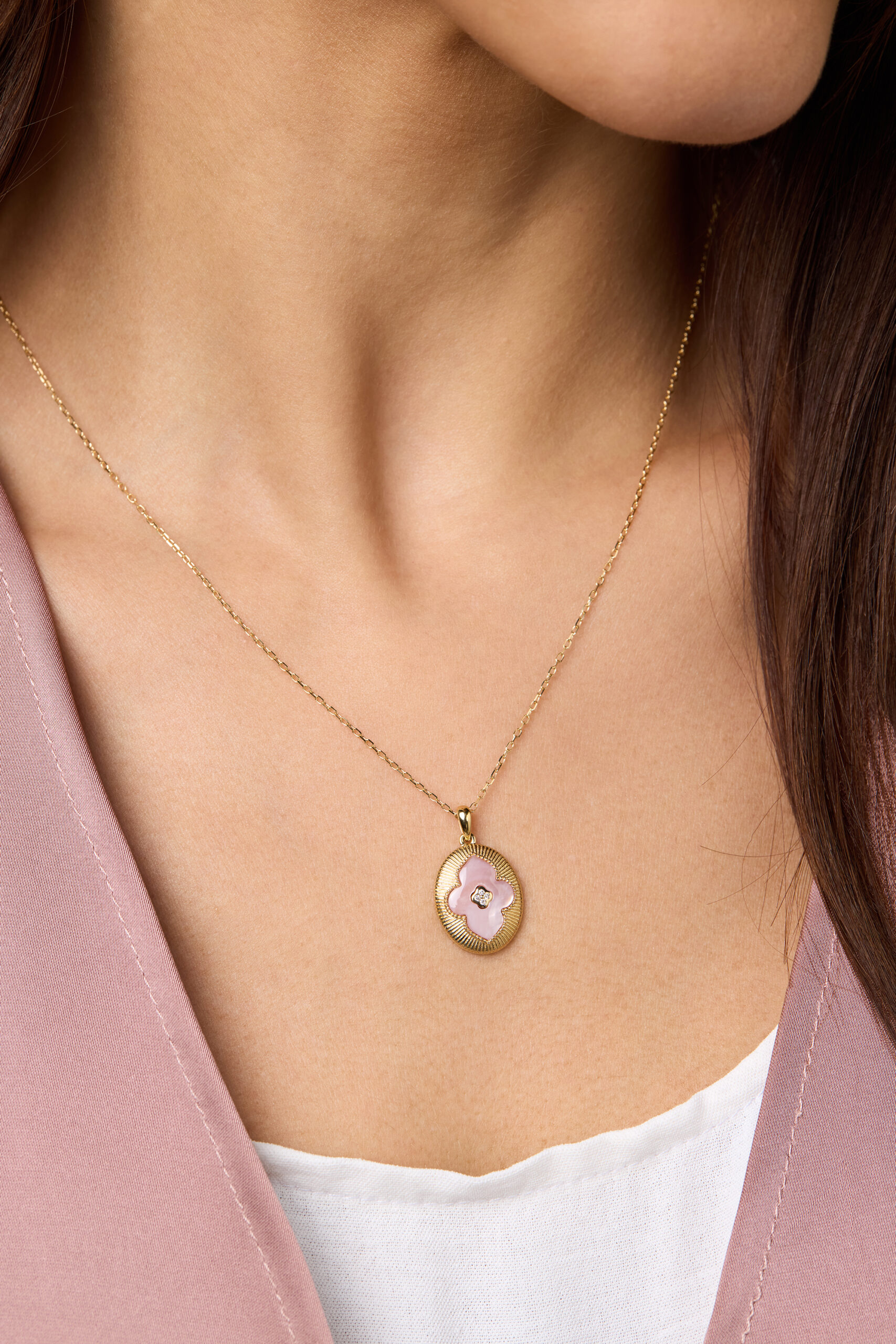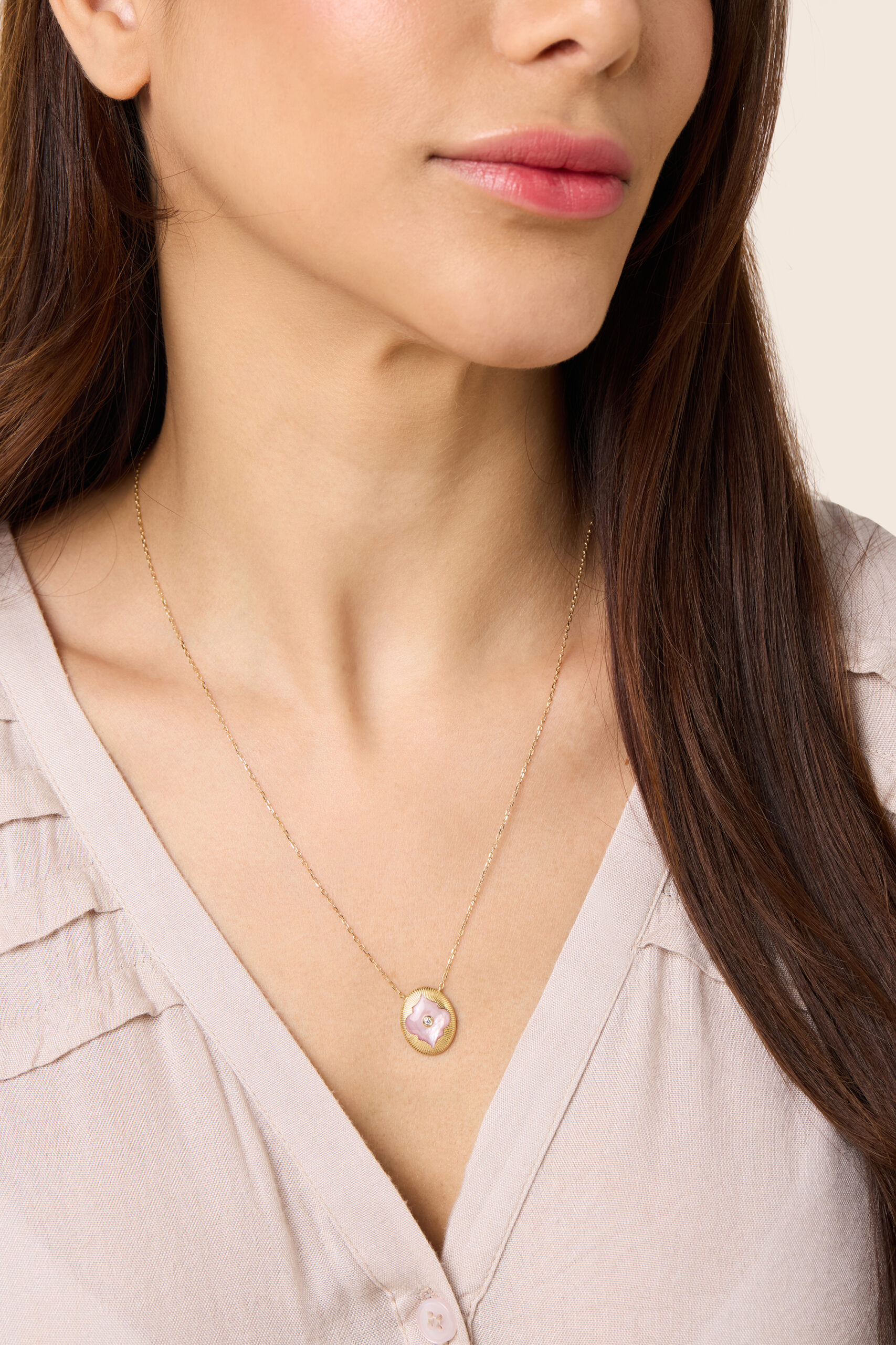A yellow gold foundation holds an arabesque bloom of pink mother of pearl glowing with grace, faith, and timeless spiritual beauty