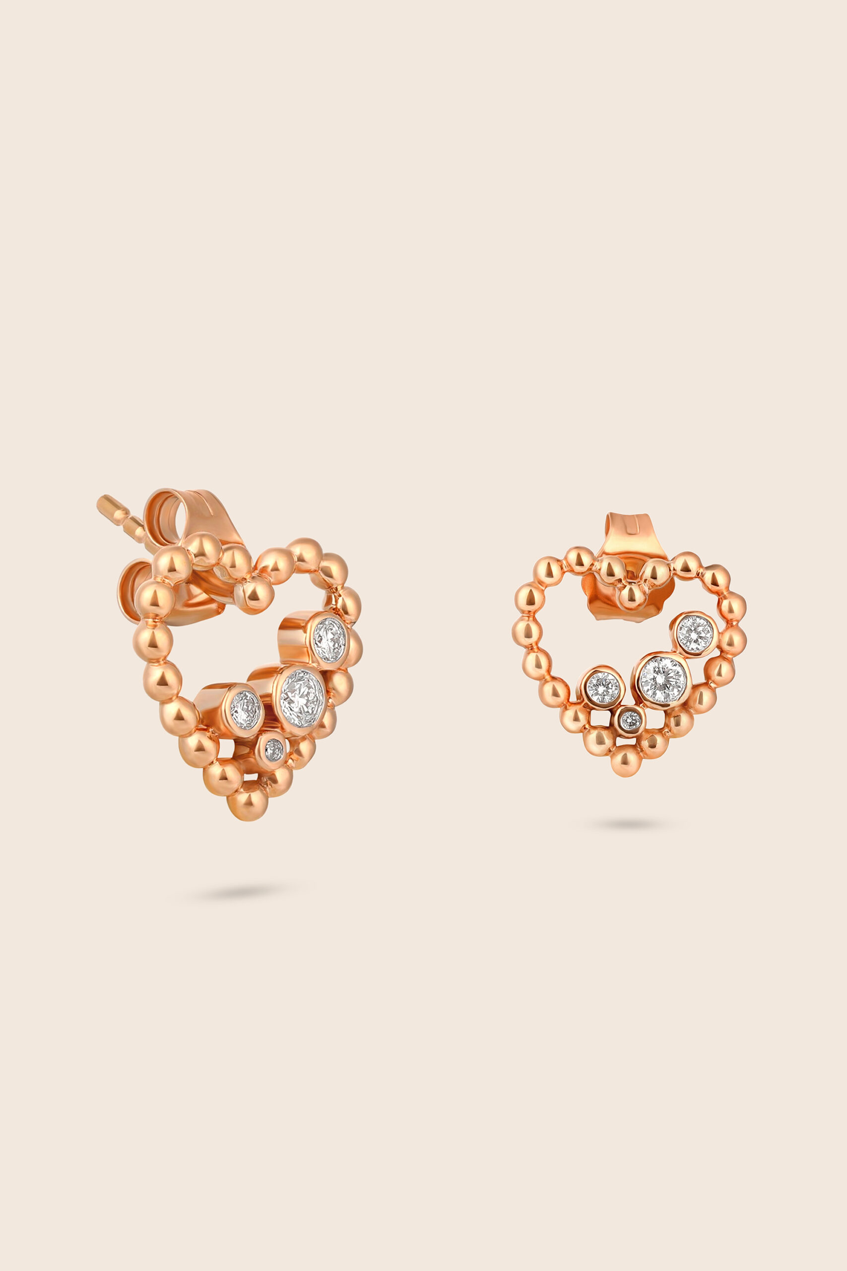 A rose gold drop of bubbles, rose gold orbs cascade in harmony, cradling diamonds that glisten like dew, embodying playful spirit and refined allure