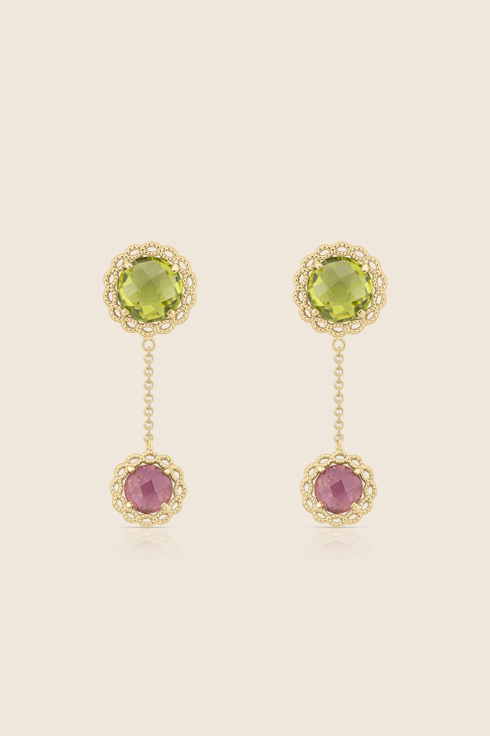 A radiant amethyst and serene peridot, encircled in gold, two souls in harmony, reflecting transparency, strength, and the ever changing hues of a woman’s resilient spirit