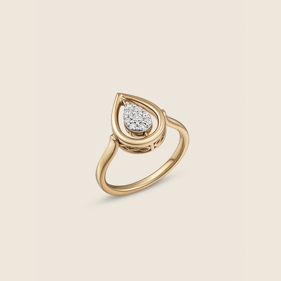A yellow gold ring holds a gentle drop, one side shimmering with diamonds, the other with emeralds. Ever-shifting, it reflects love?s many moods, capturing quiet moments and the soft sparkle of memories worn close.