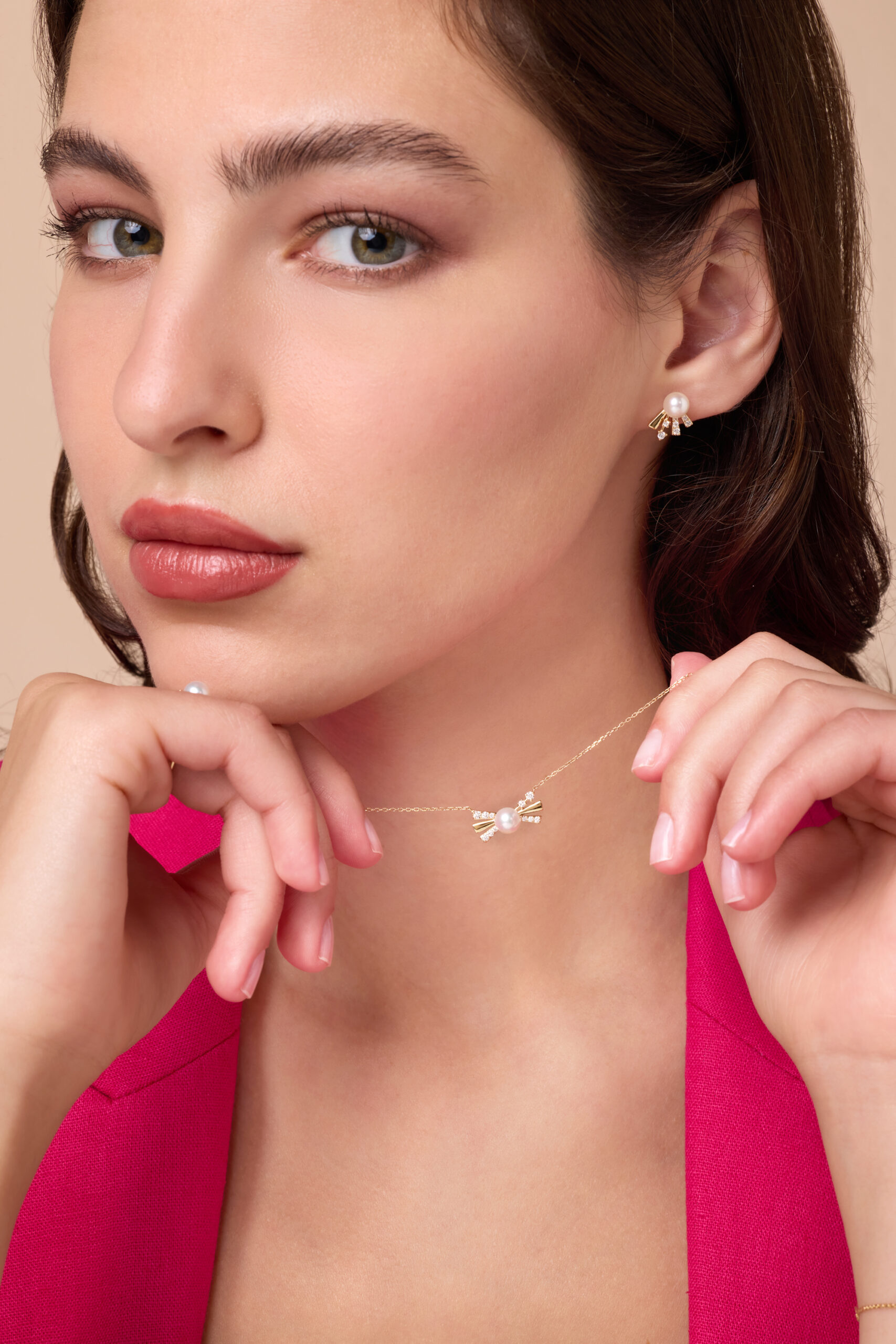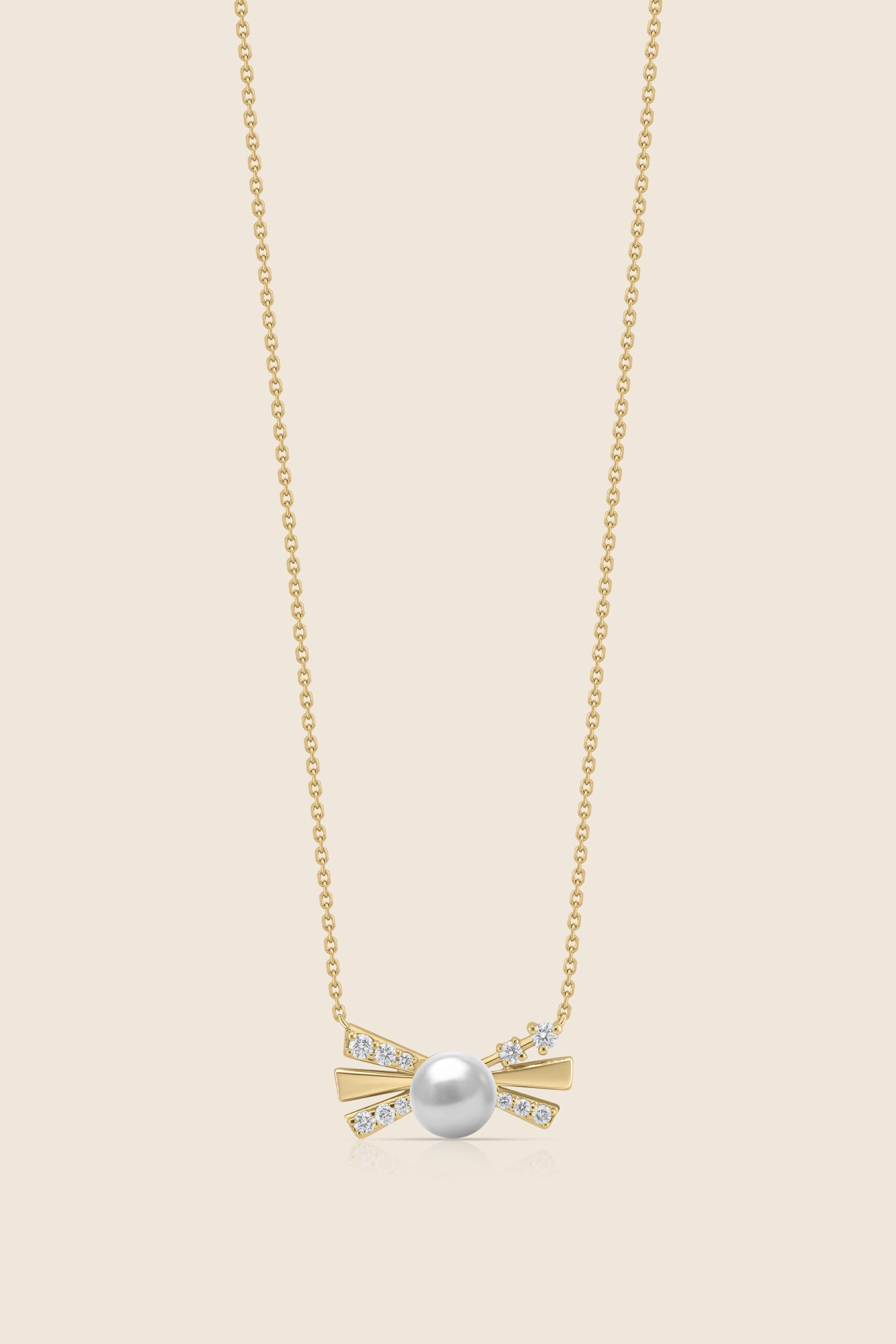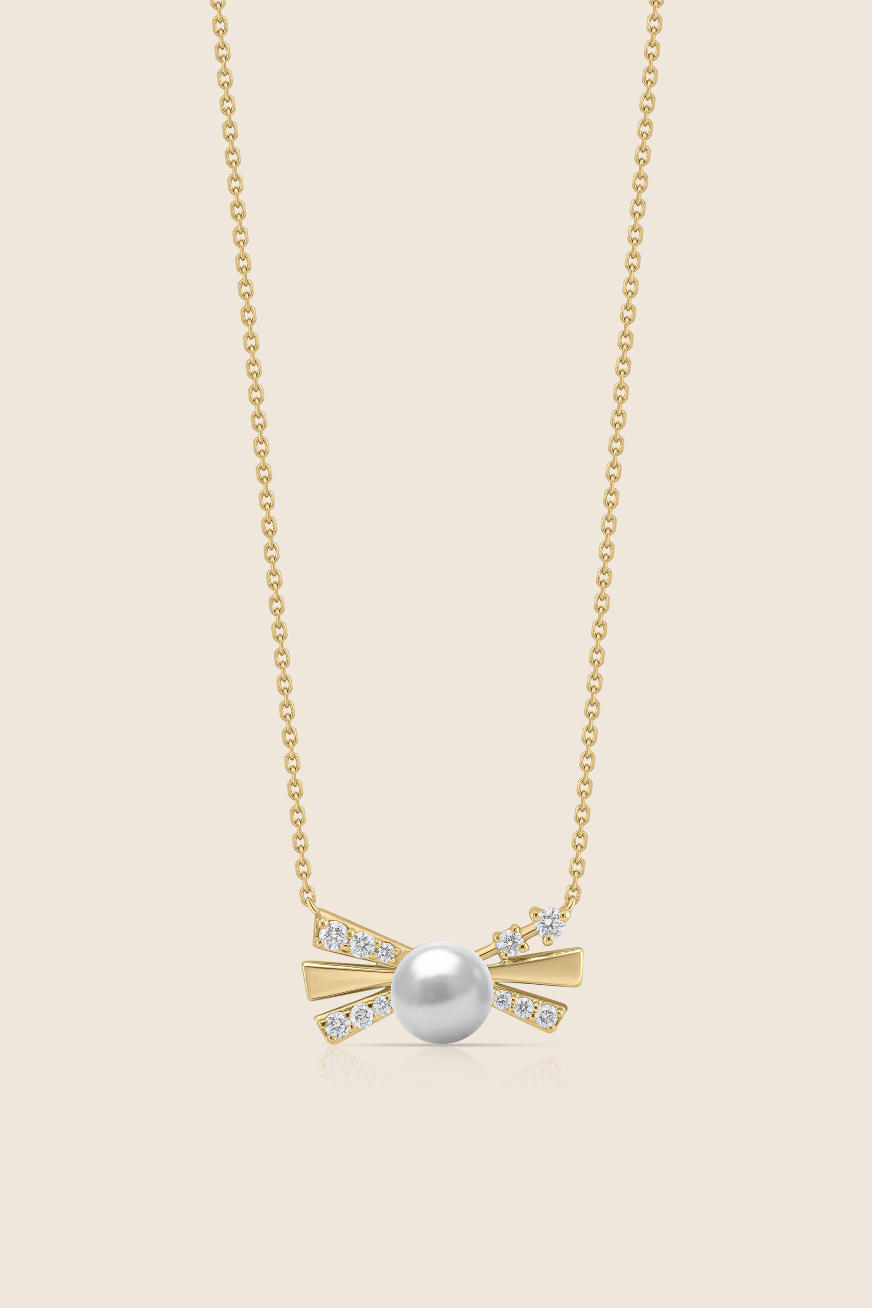 A graceful rose gold bow pendant adorned with shimmering diamonds and a luminous center pearl, symbolizing delicate elegance, femininity, and timeless allure.