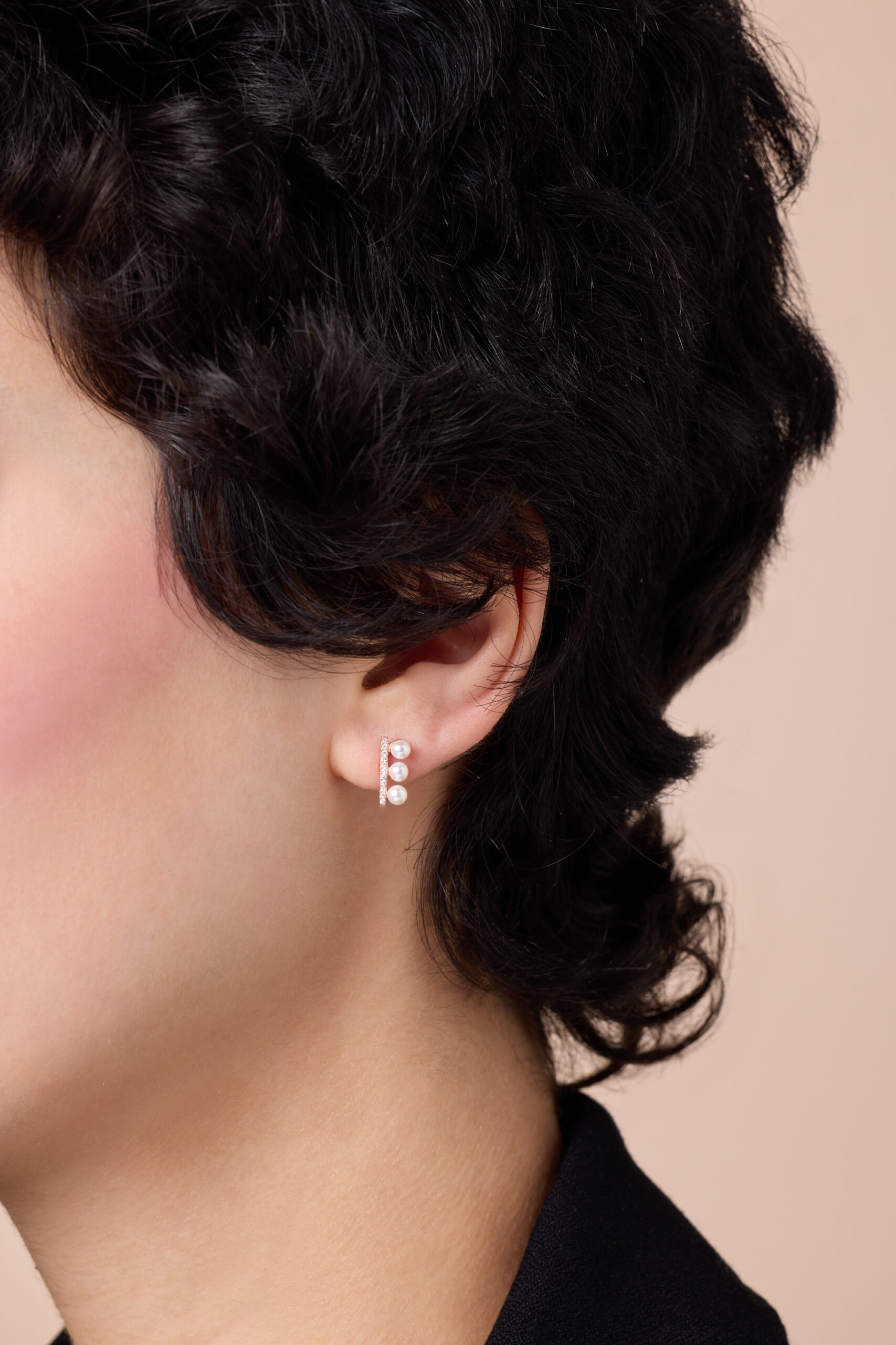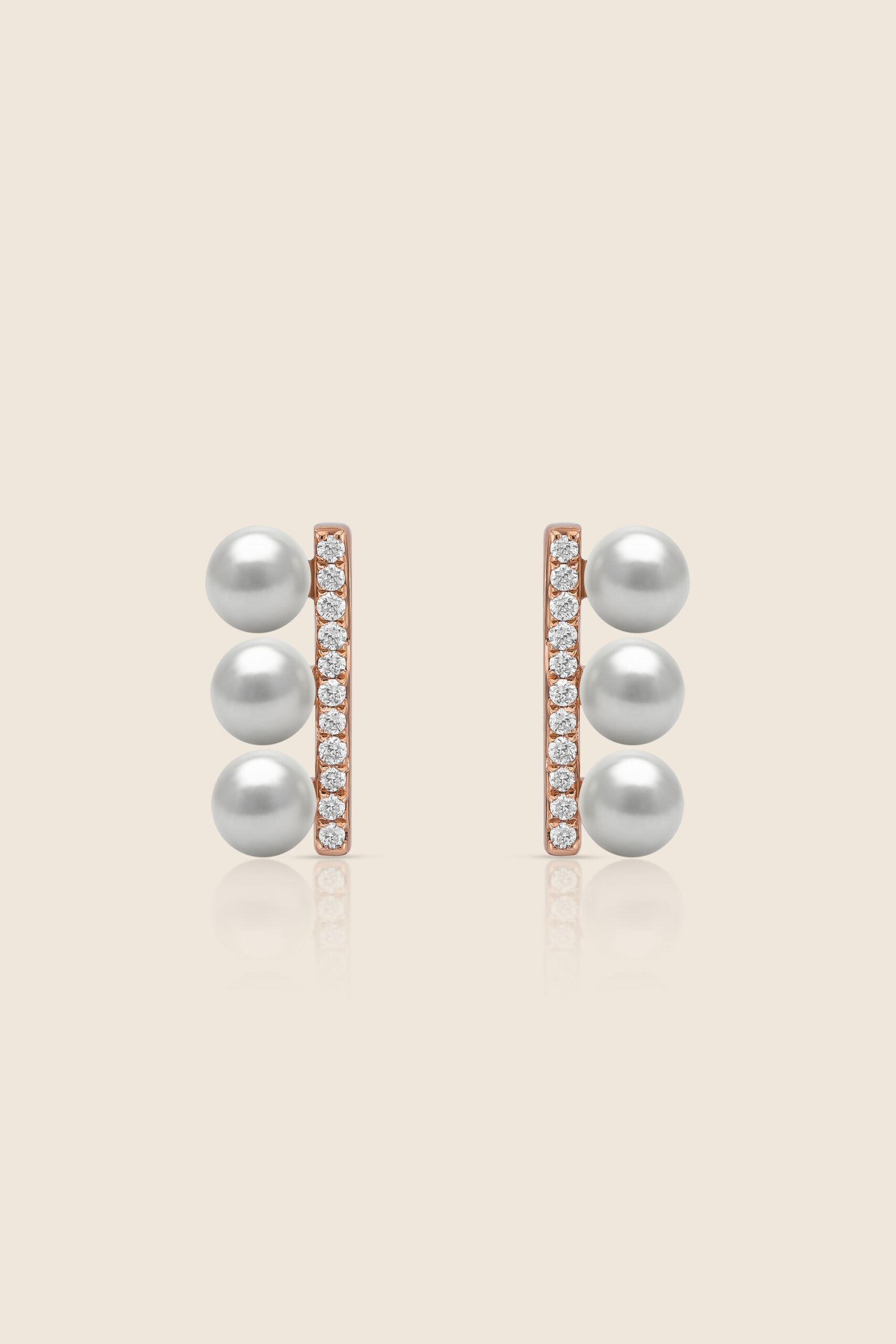 Shimmering with diamonds, a radiant line of rose gold gives way to five dangling pearls, forming an elegant cascade that mirrors the rhythm and grace of flowing waves