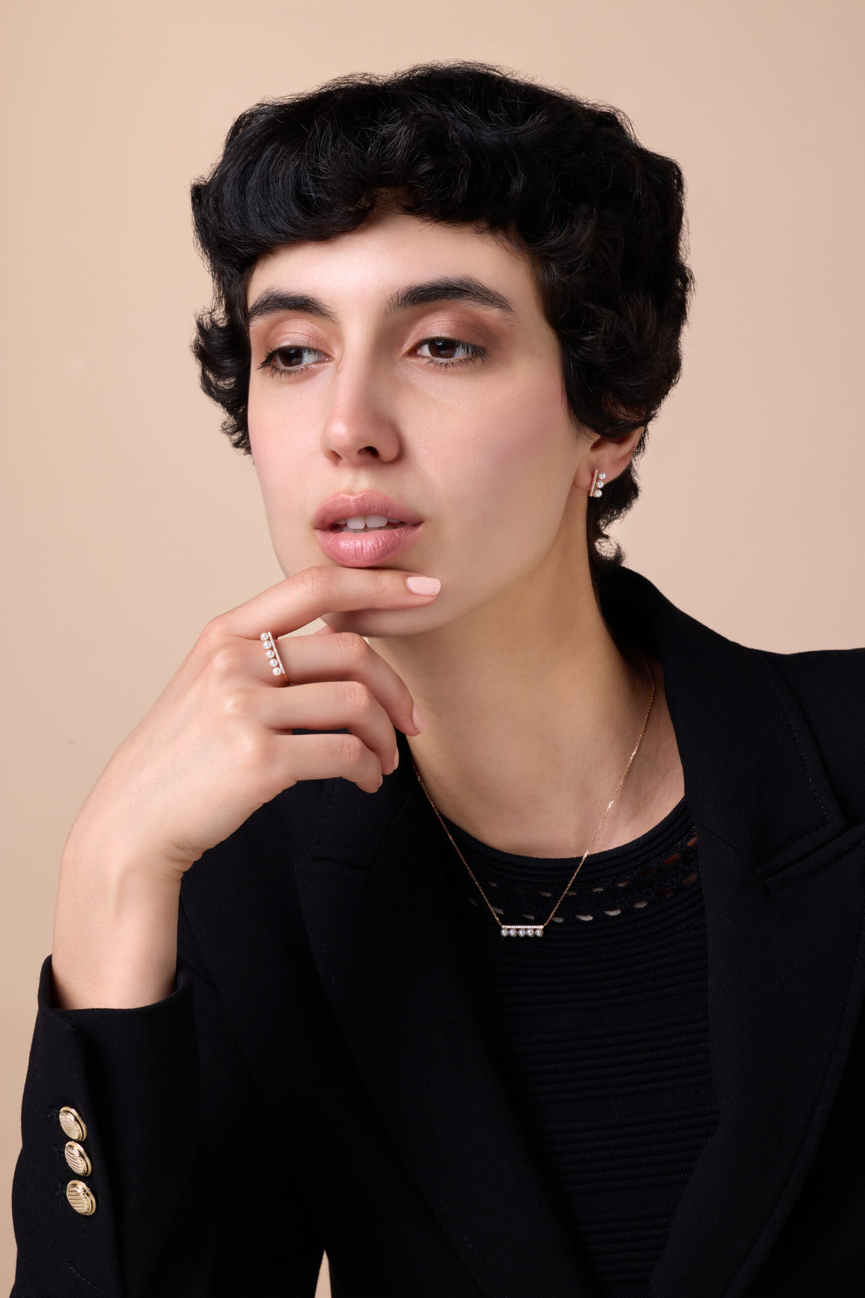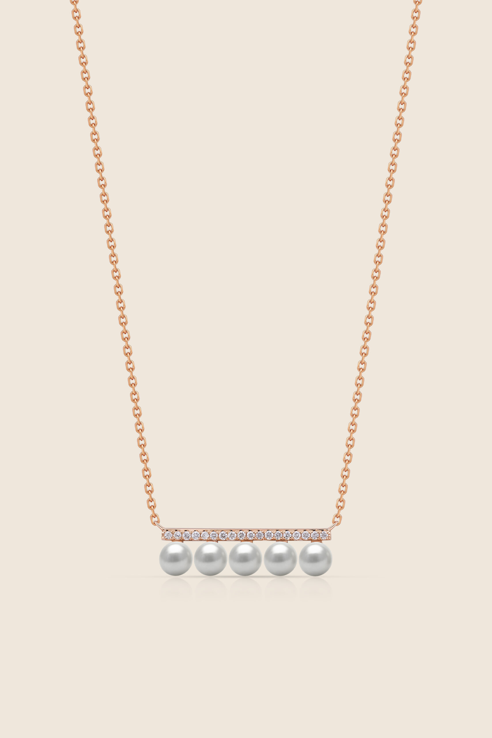 Shimmering with diamonds, a radiant line of rose gold gives way to five dangling pearls, forming an elegant cascade that mirrors the rhythm and grace of flowing waves