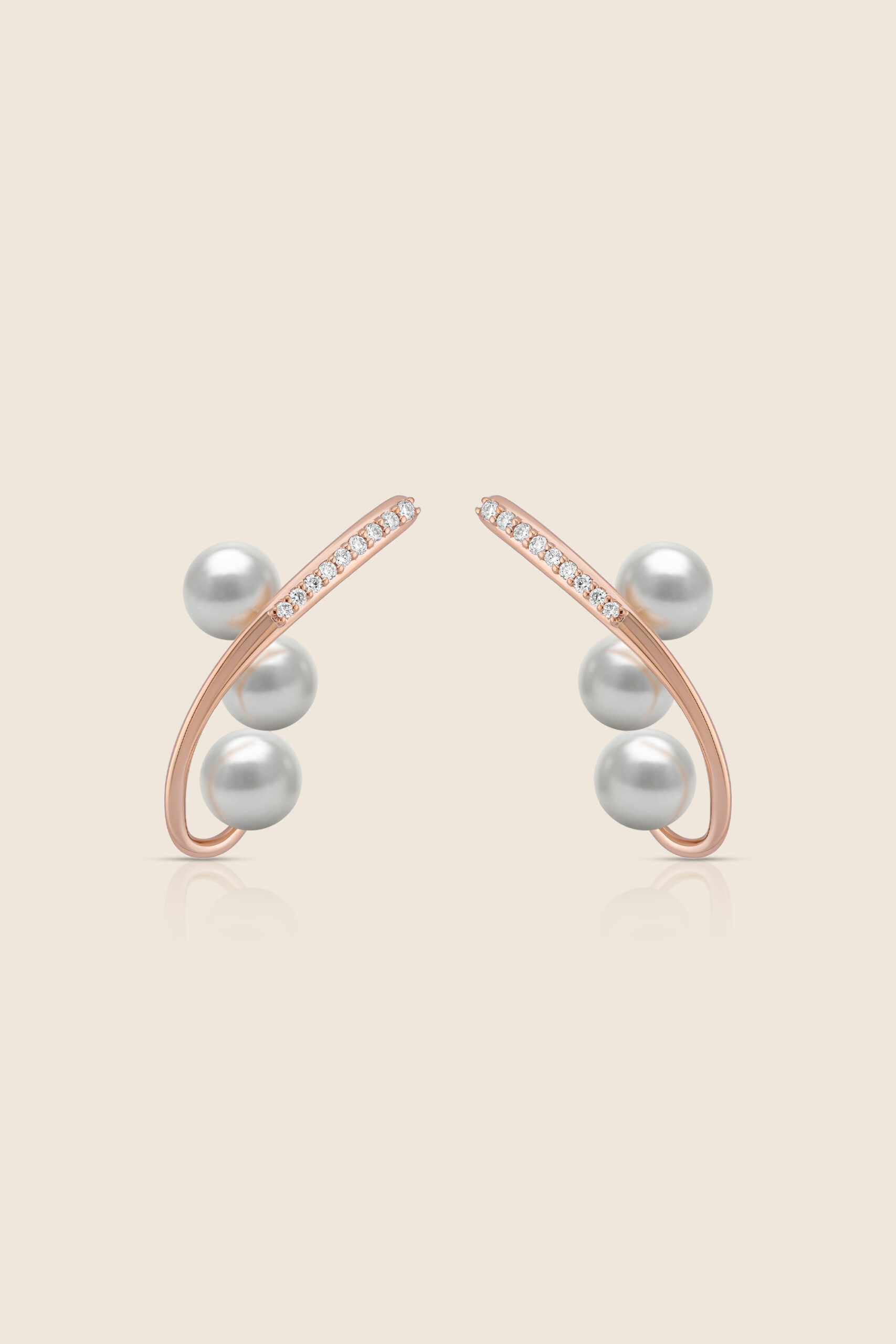 A graceful curve of rose gold lined with diamonds and adorned with three luminous pearls, this earring evokes fluid beauty, balance, and refined elegance.