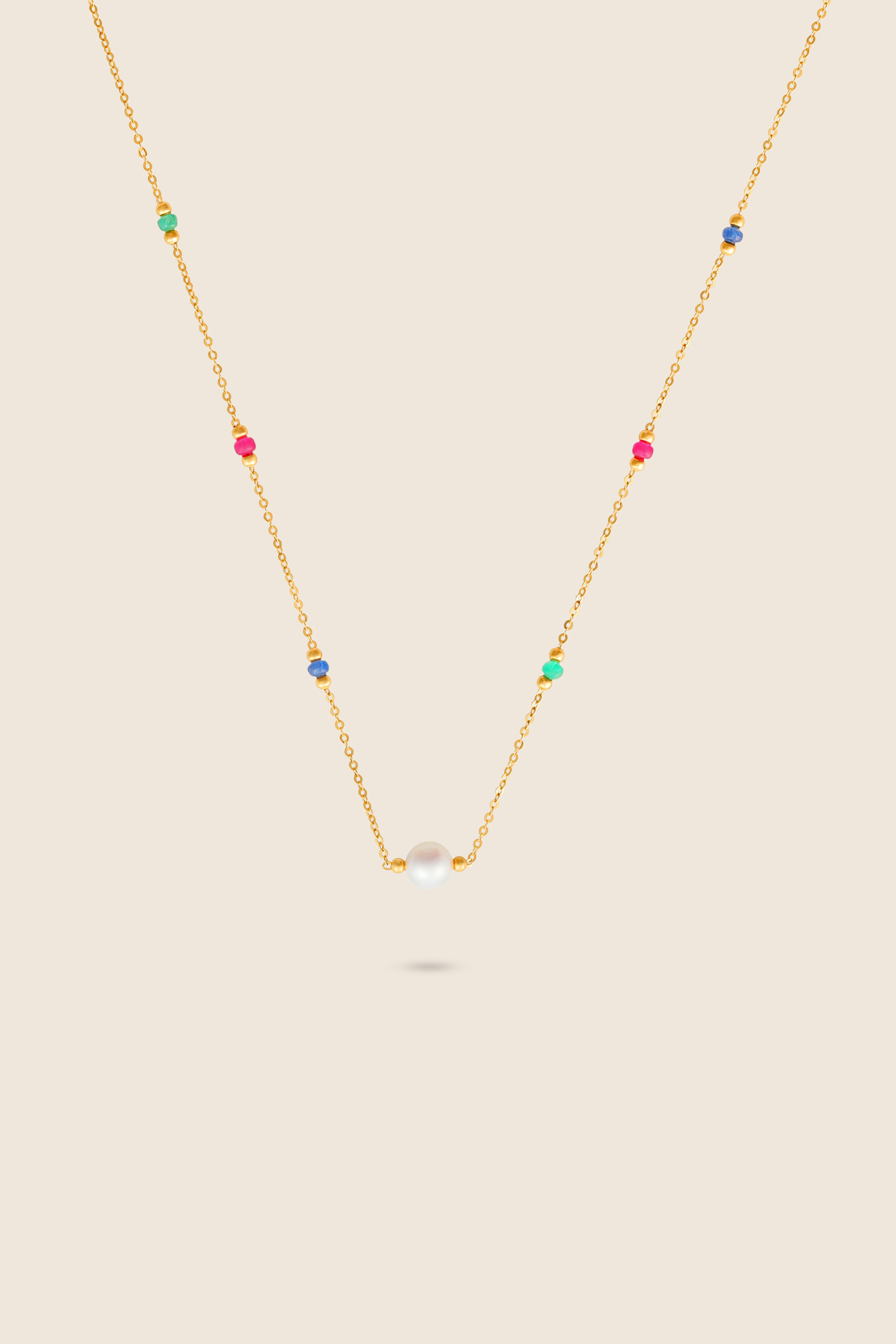 Featuring a central luminous pearl surrounded by sparkling semi-precious gemstones, the necklace is seen as an elegant celebration of color, balance, and timeless natural beauty