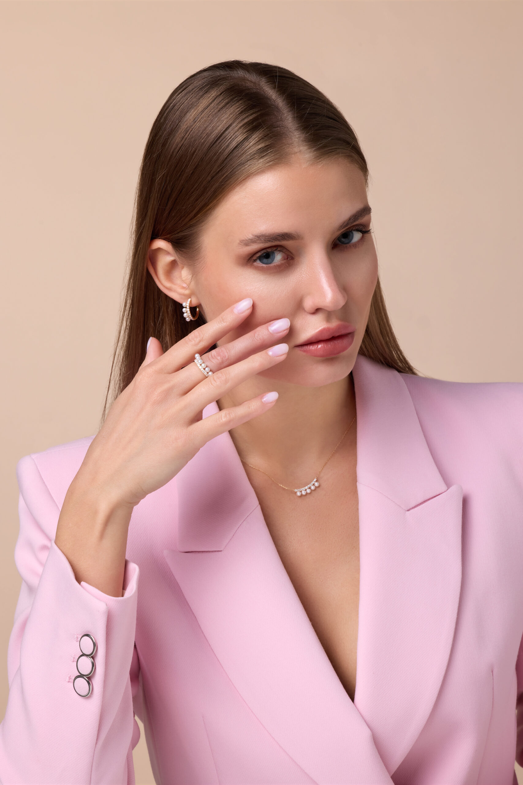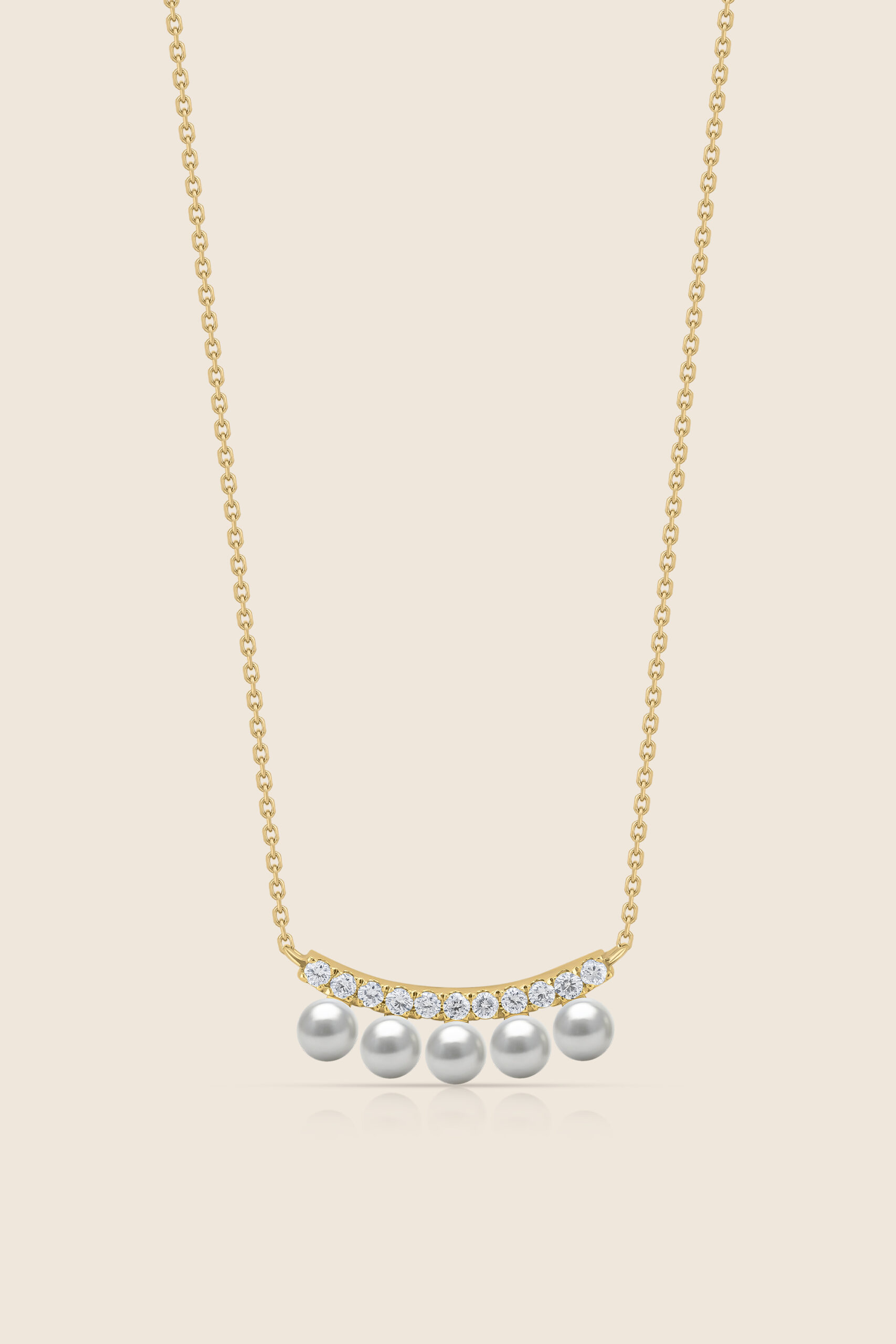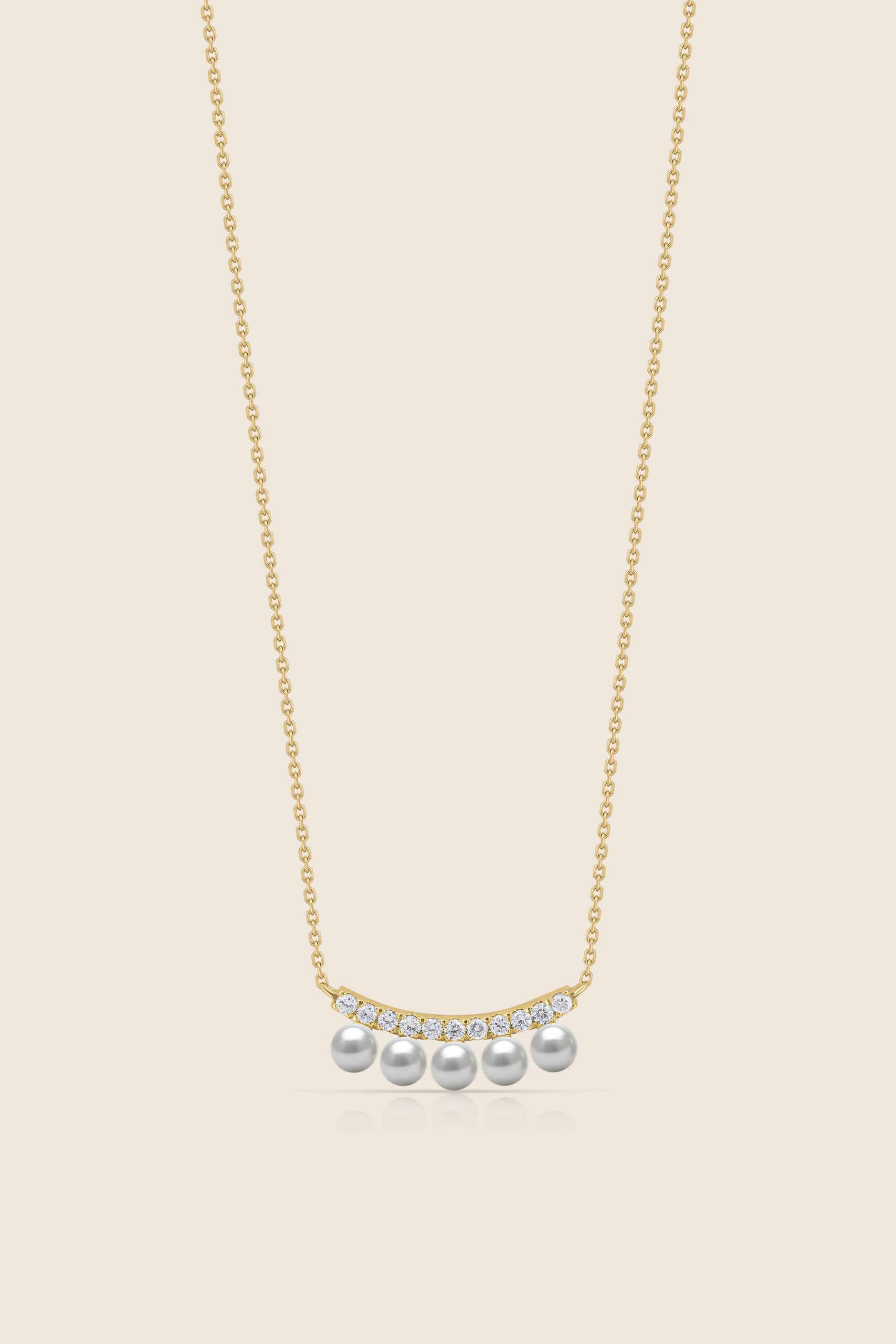 A flowing curve of yellow gold adorned with sparkling diamonds and luminous pearls, this pendant evokes harmony, graceful movement, and timeless elegance.