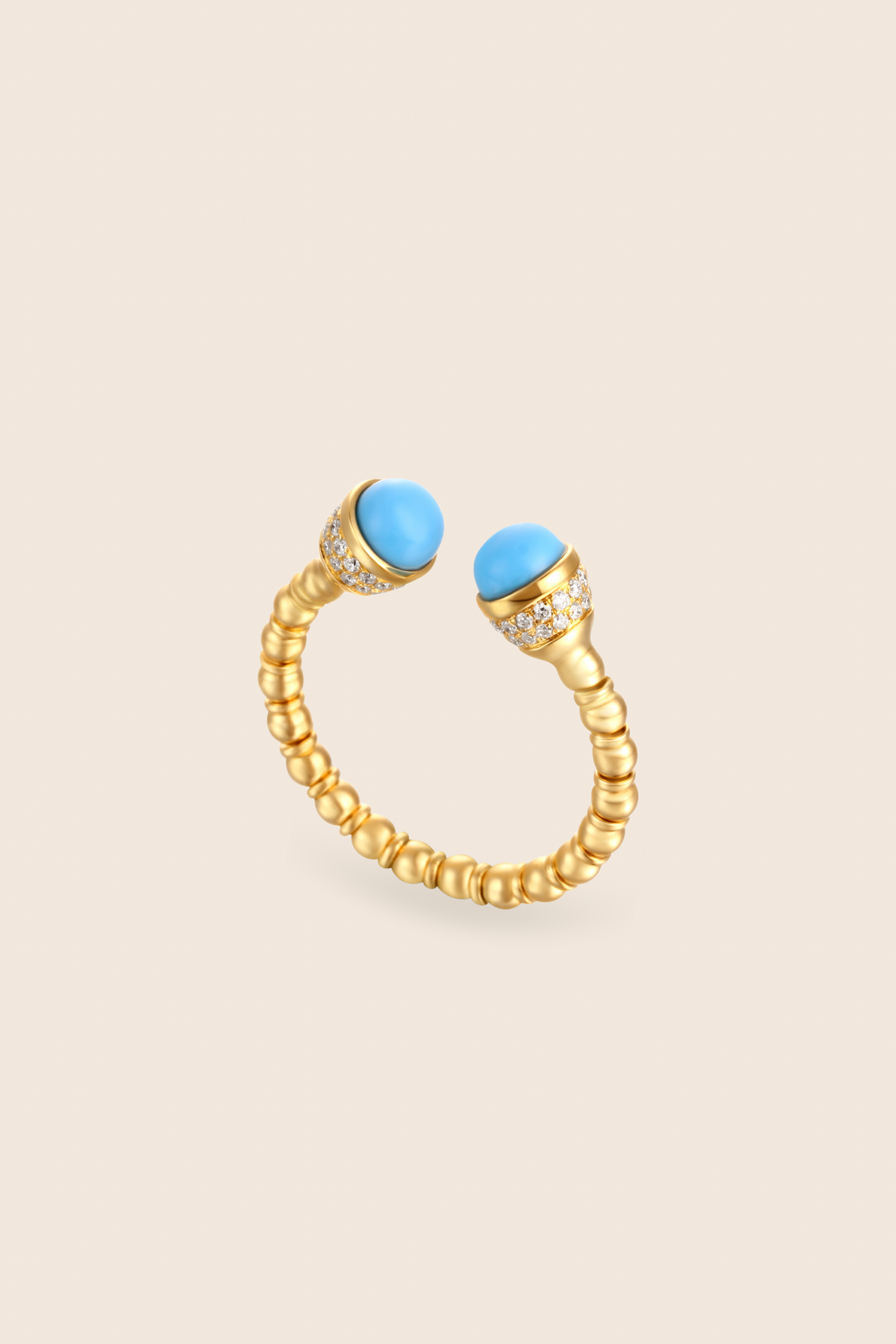 A vivid turquoise stone embraced by yellow gold and shimmering diamonds celebrating vitality, harmony, and the radiant spirit of timeless elegance.
