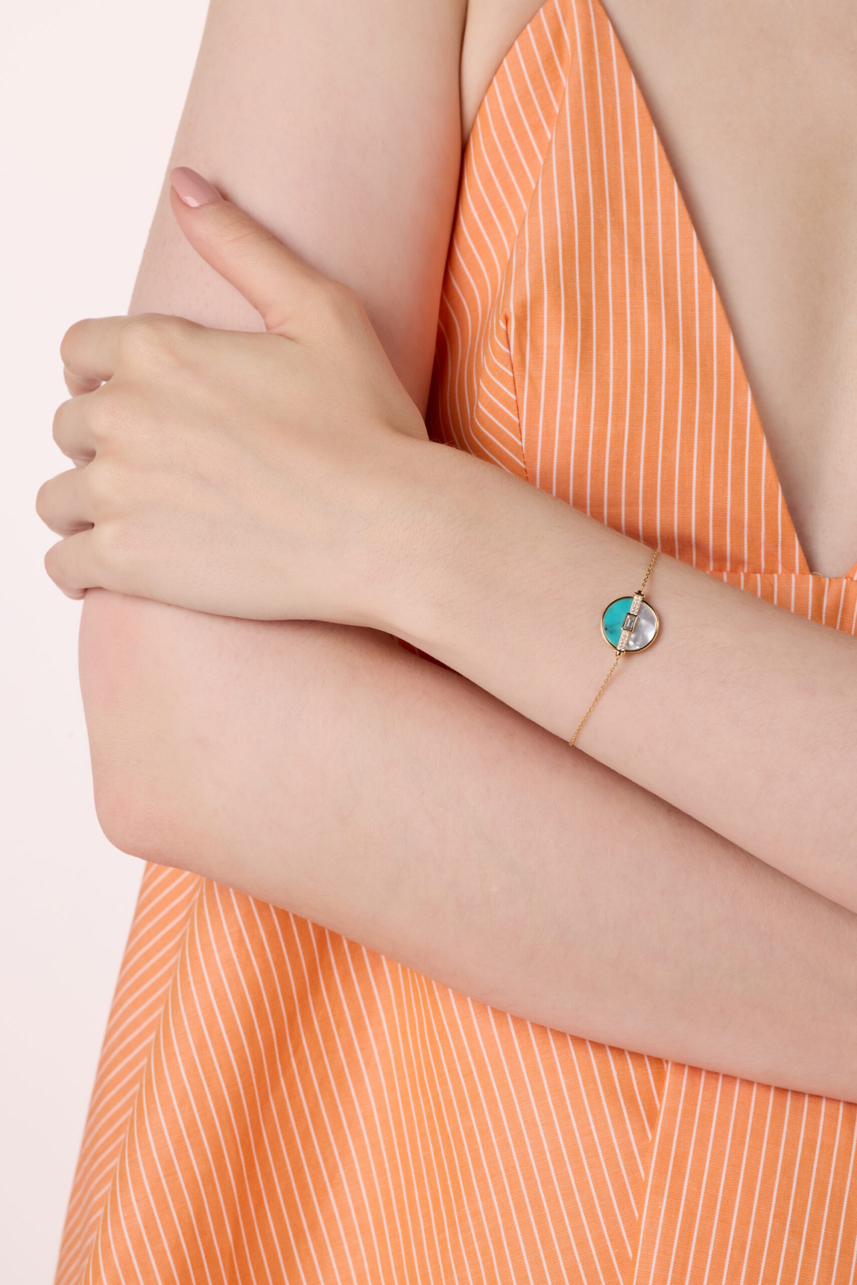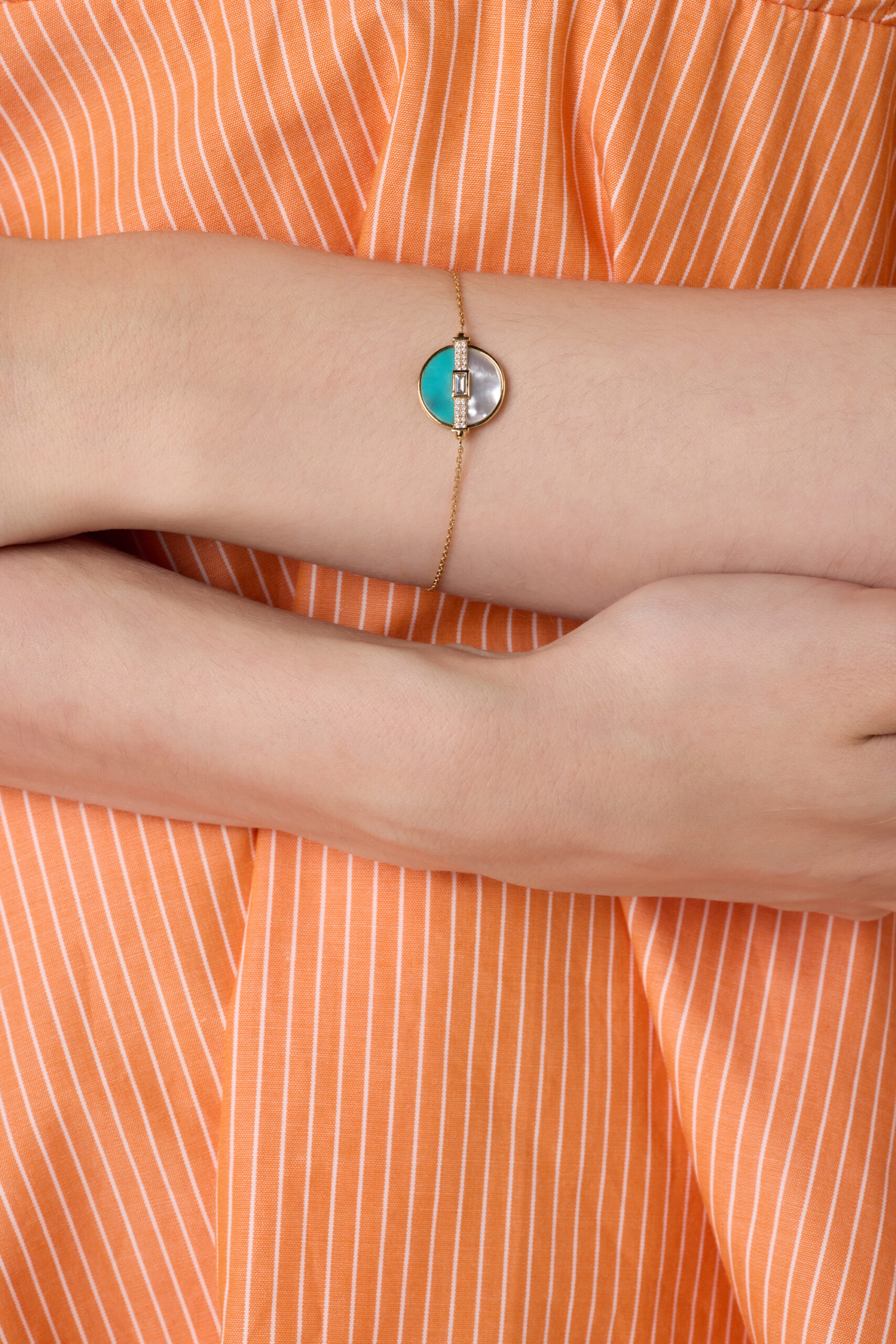 Turquoise and mother of pearl shine beside diamonds in yellow gold capturing serenity, light, and the joyful harmony of nature?s contrasting beauty.