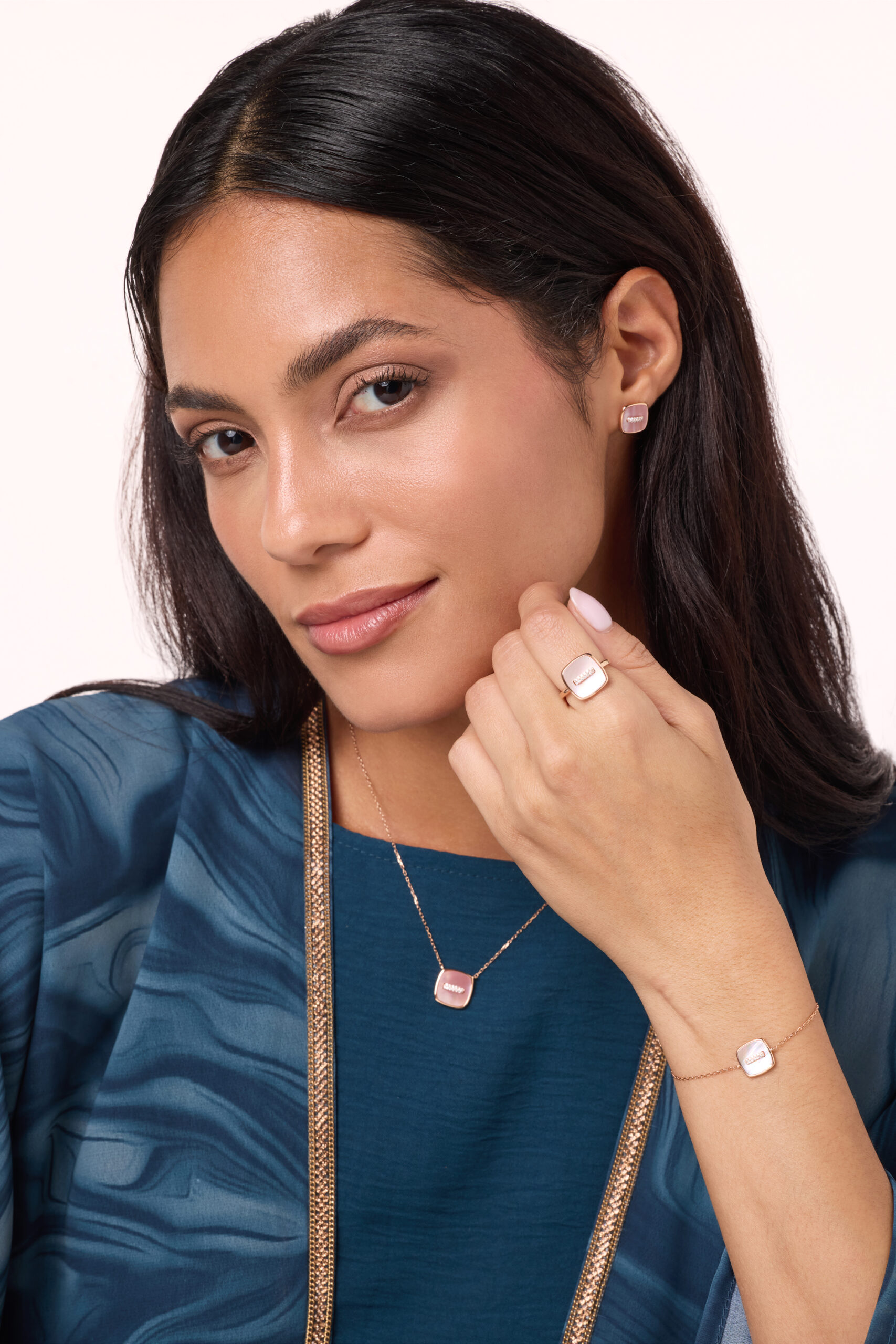 Luminous mother of pearl is set within a golden cushion and adorned with sparkling diamonds, where subtle geometry and radiant elegance are brought together to celebrate purity, light, and individuality