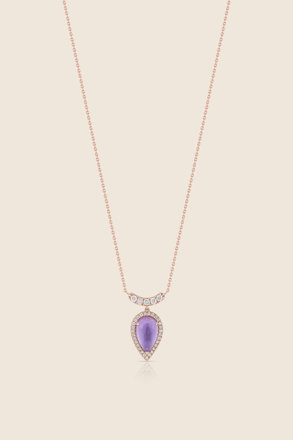 An amethyst raindrop is embraced by rose gold and accented with a flowing curve of diamonds, where elegance, harmony, and the timeless beauty of the spirit are reflected
