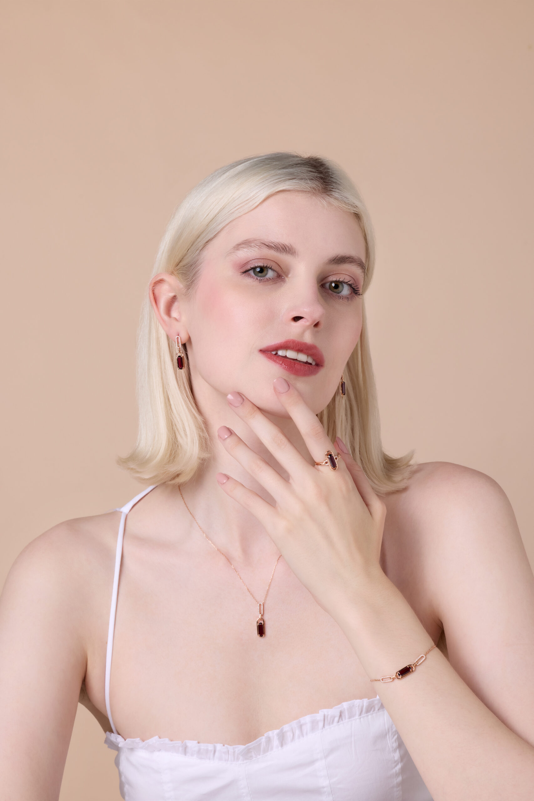 A deep garnet heart framed by sparkling diamonds in rose gold. capturing passion, courage, and the timeless essence of bold elegance.