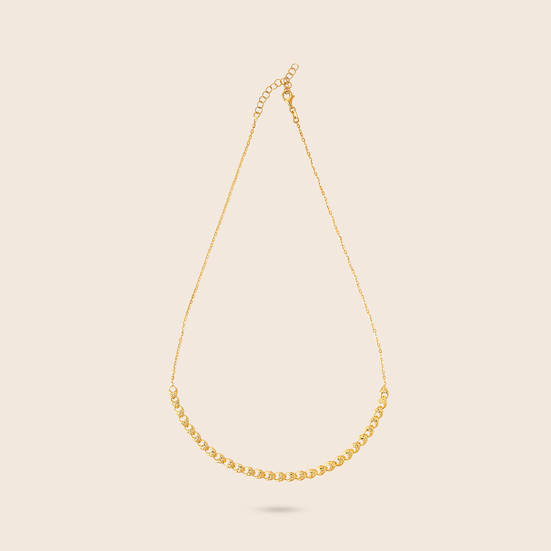 Crowned at the front with bold yellow gold links that fade into delicate golden strands, the necklace is defined by a blend of strength and elegance a subtle celebration of unity and timeless flow