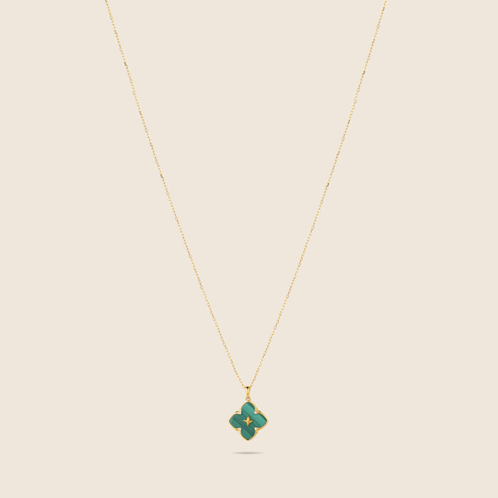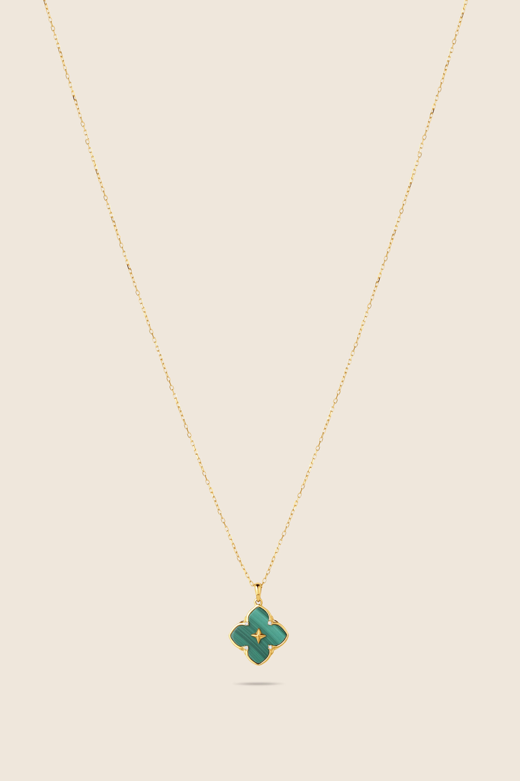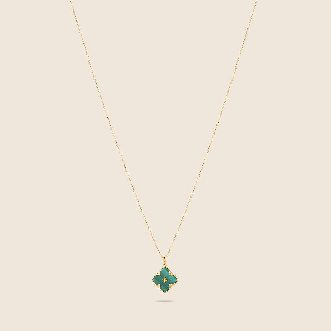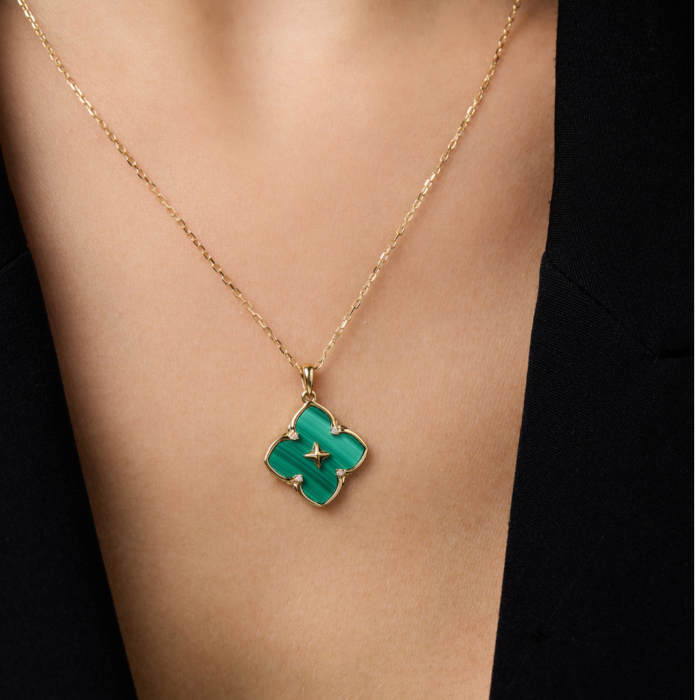 A yellow gold frame set with vivid malachite, its edges adorned with diamonds reflecting harmony, resilience, and eternal grace.