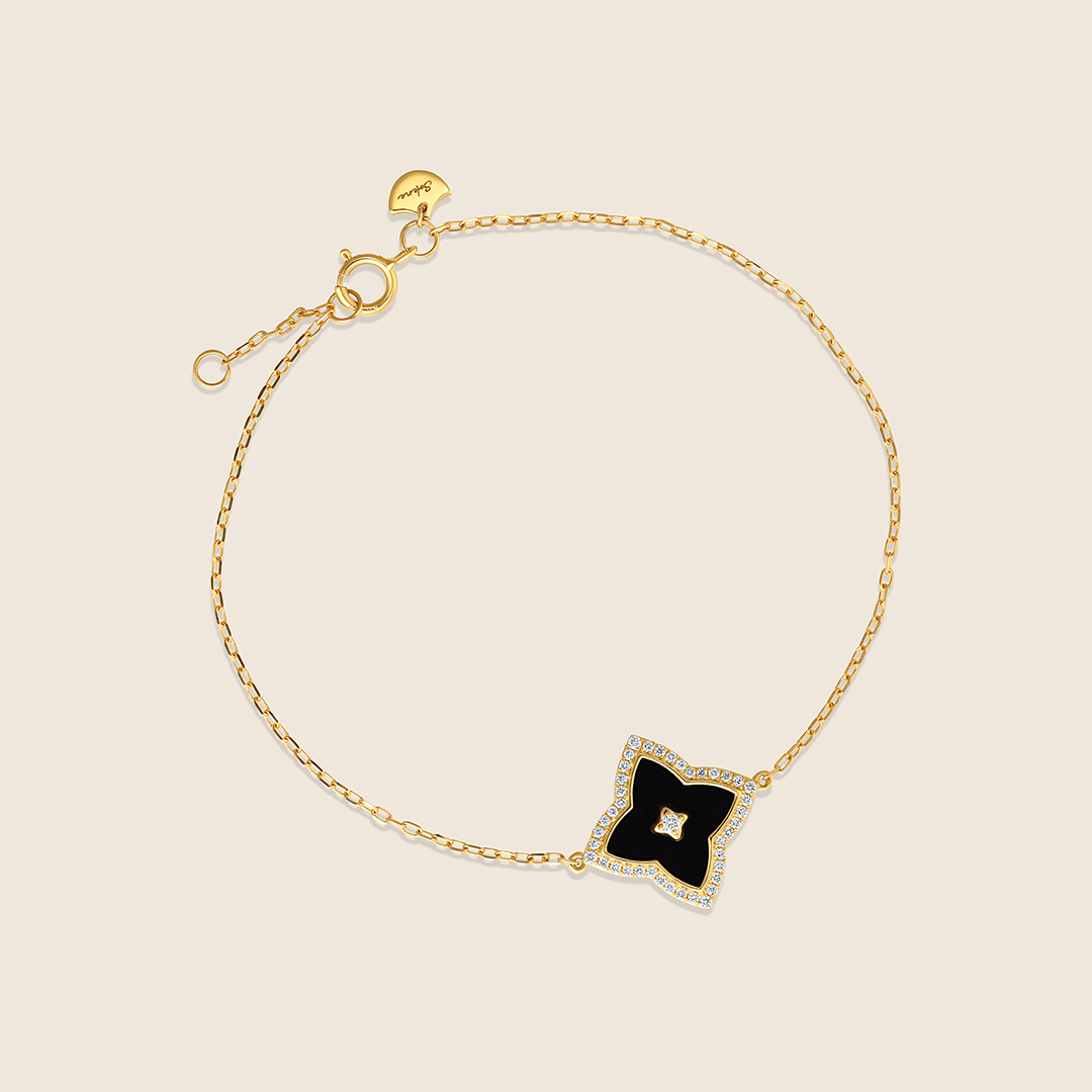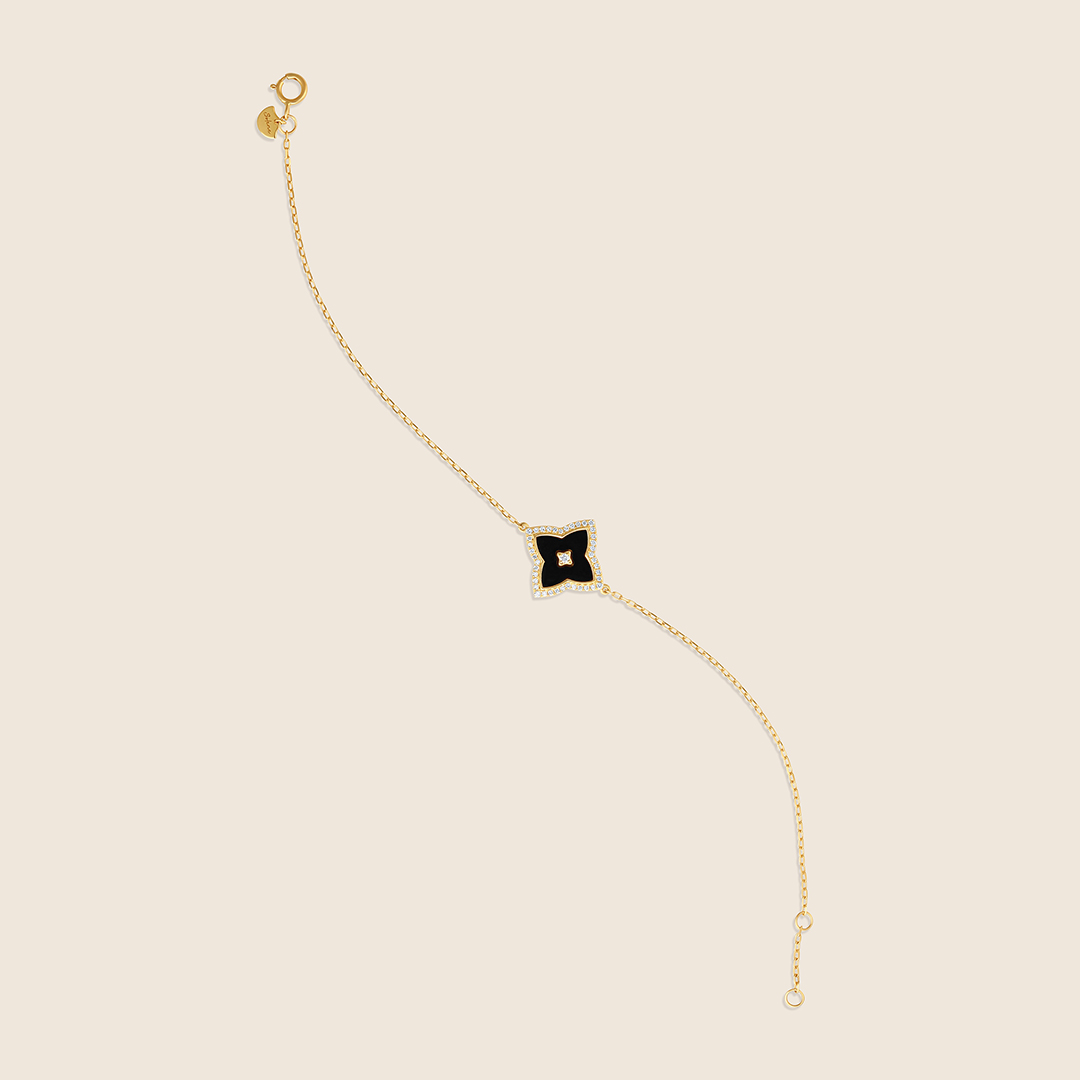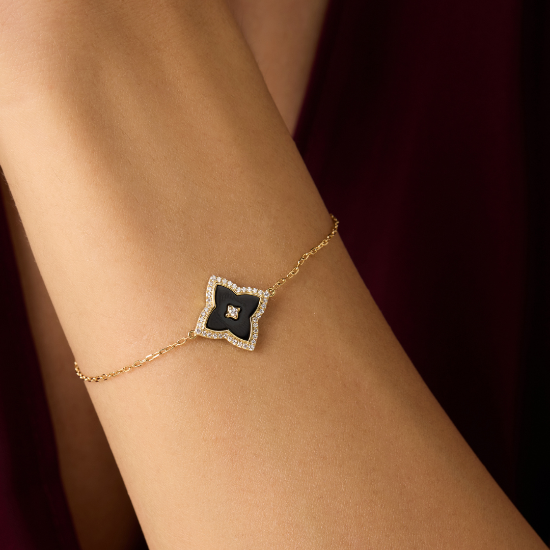 A black onyx flower edged in yellow gold, adorned with diamonds, an emblem of resilience, faith, and enduring inner strength