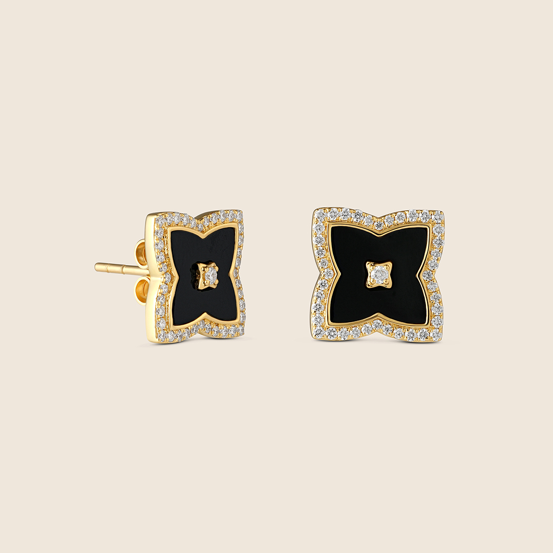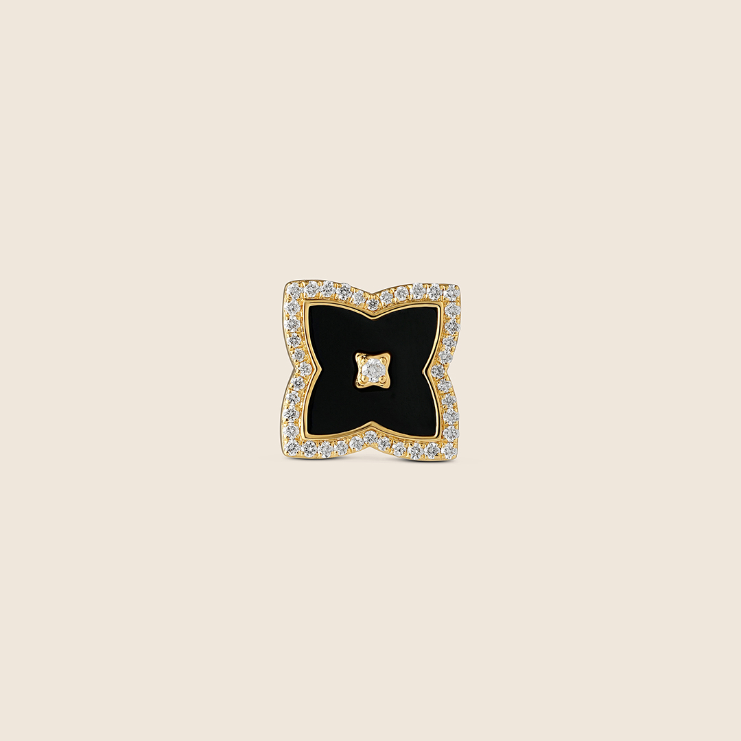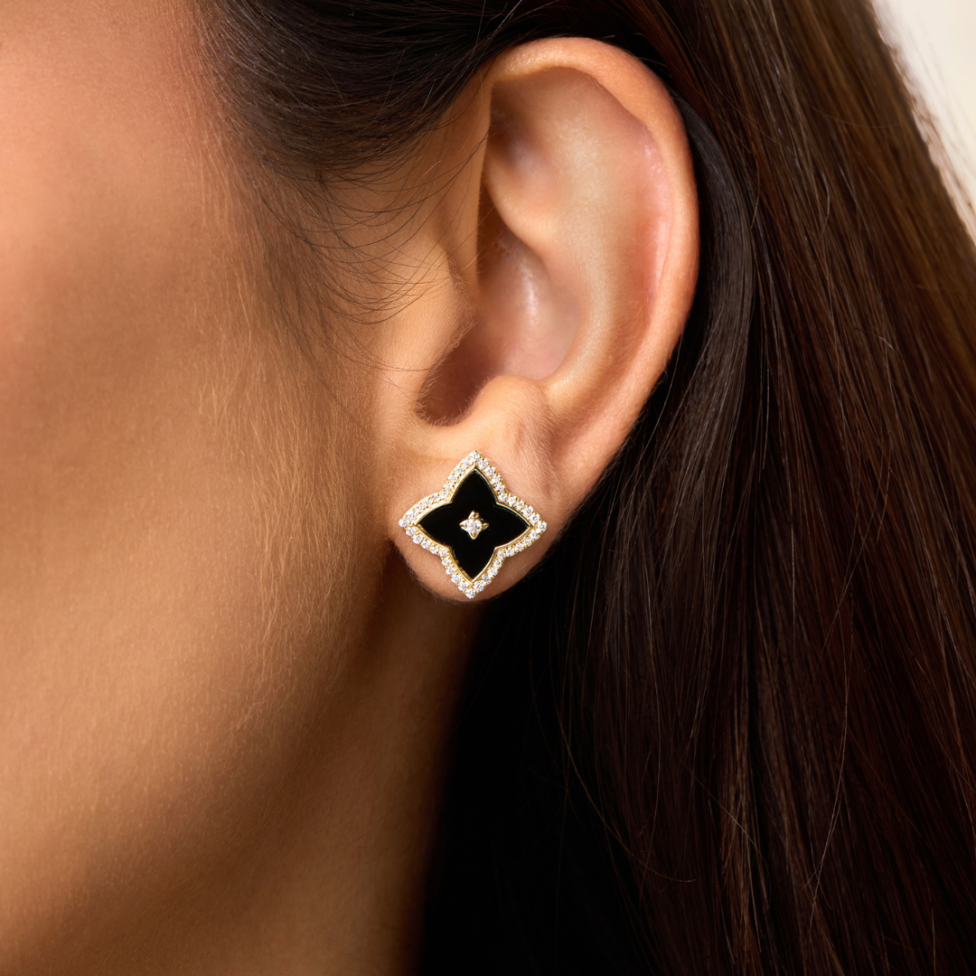 A black onyx flower edged in yellow gold, adorned with diamonds, an emblem of resilience, faith, and enduring inner strength