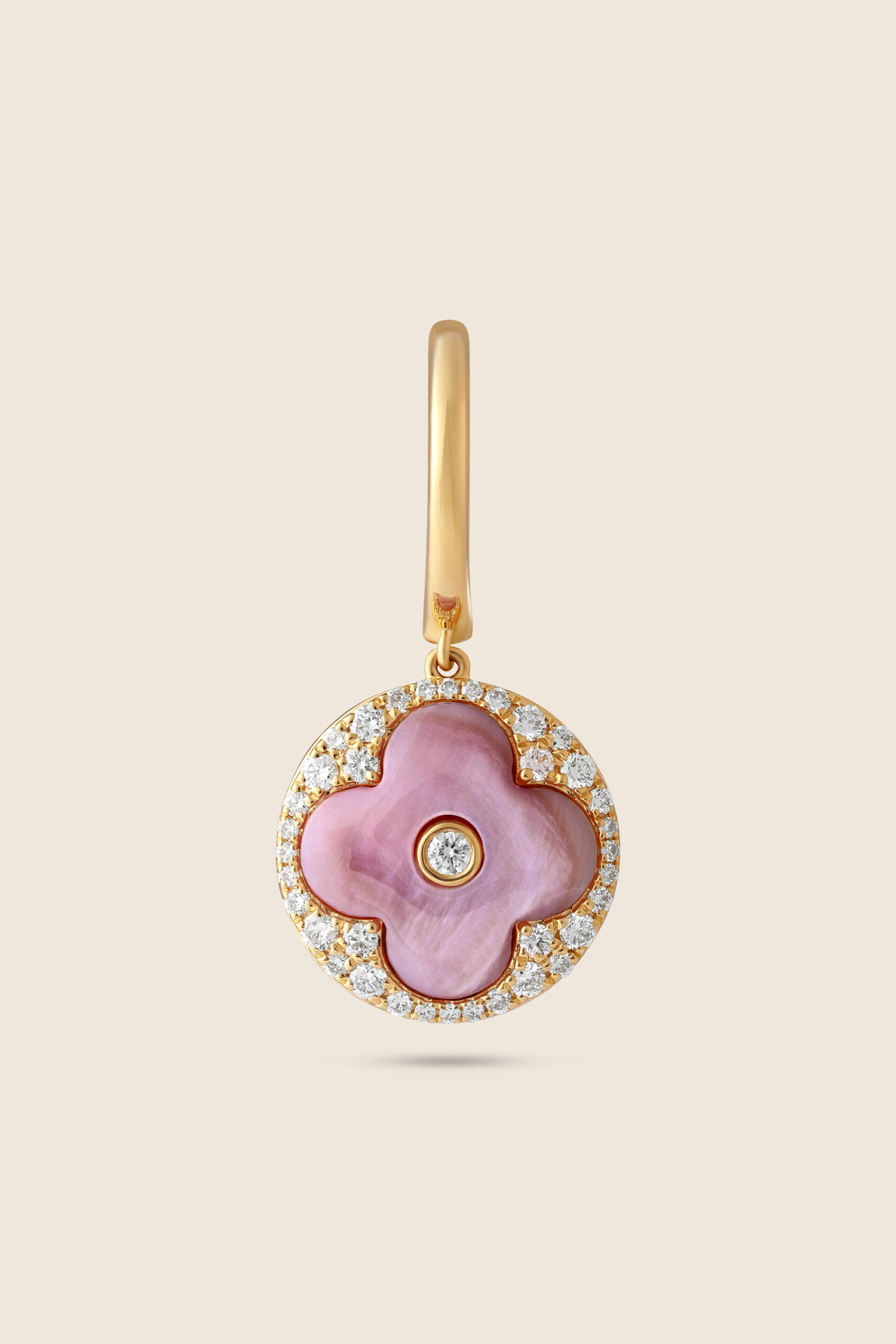 A pink mother of pearl blossom, framed in yellow gold and lit with diamonds radiating unity, faith, and timeless feminine elegance