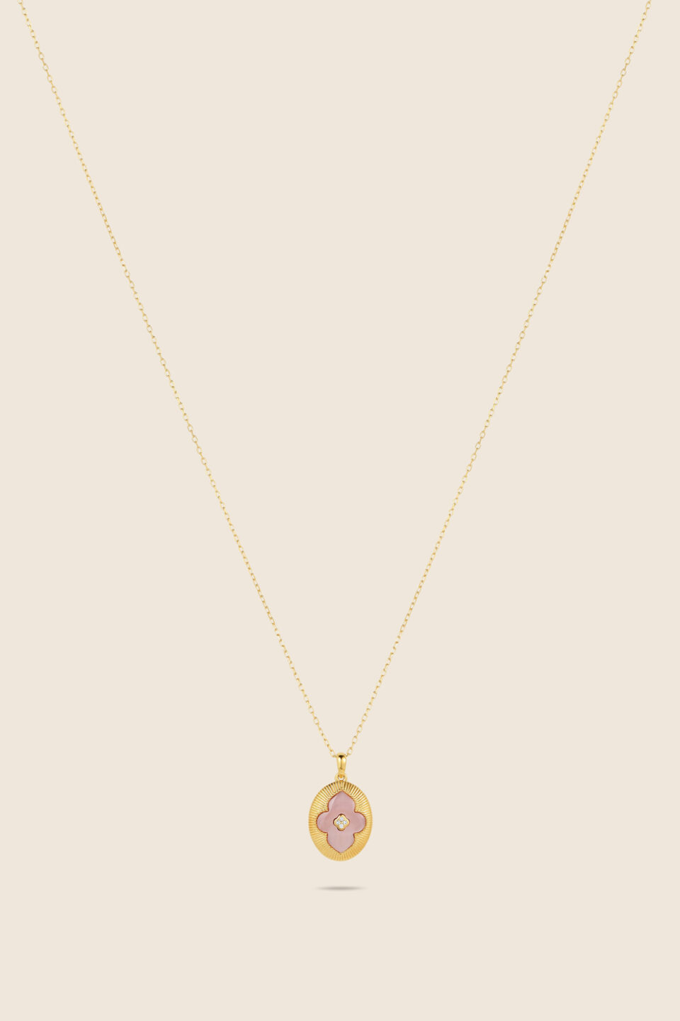 A pink mother of pearl blossom, framed in yellow gold and lit with diamonds radiating unity, faith, and timeless feminine elegance