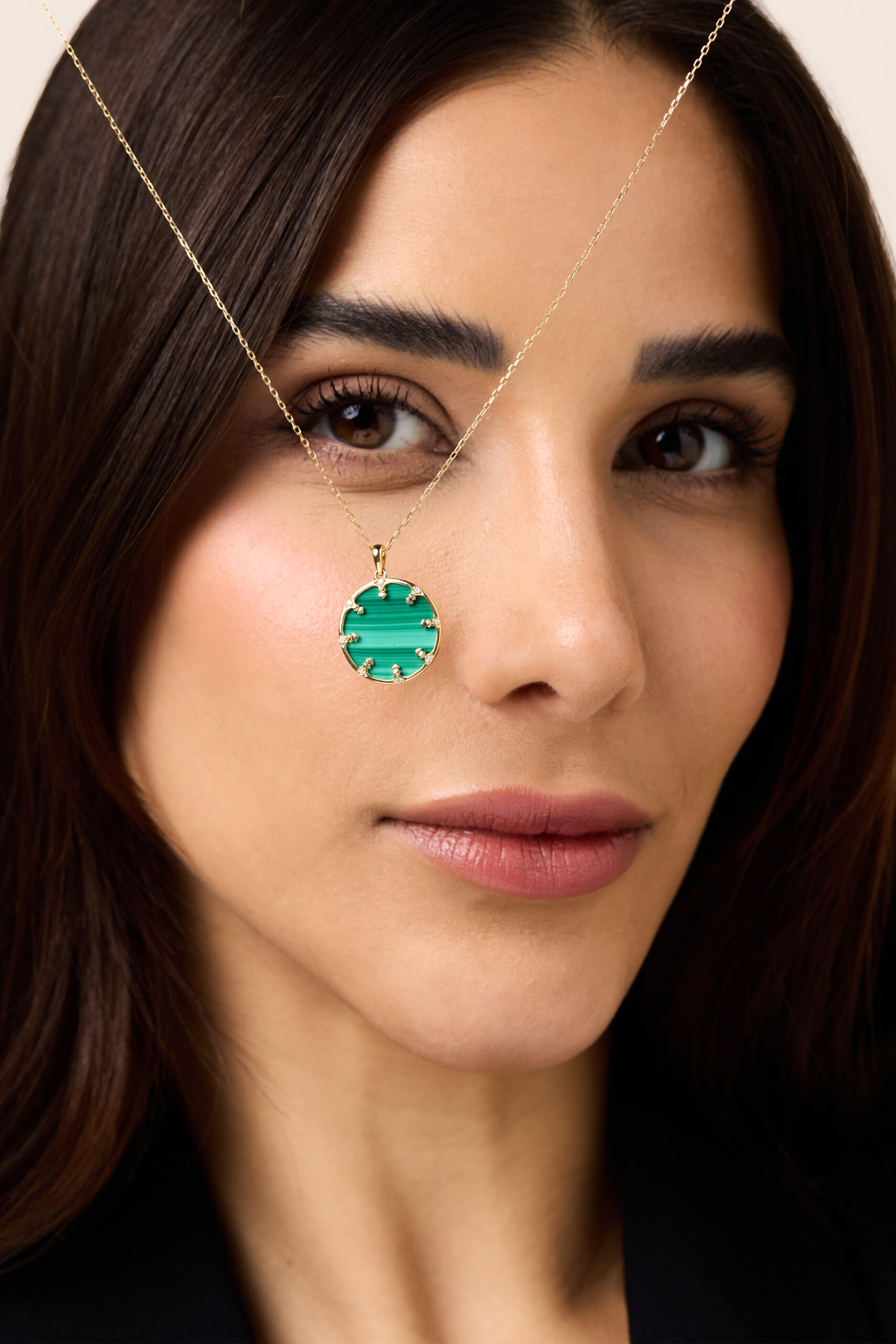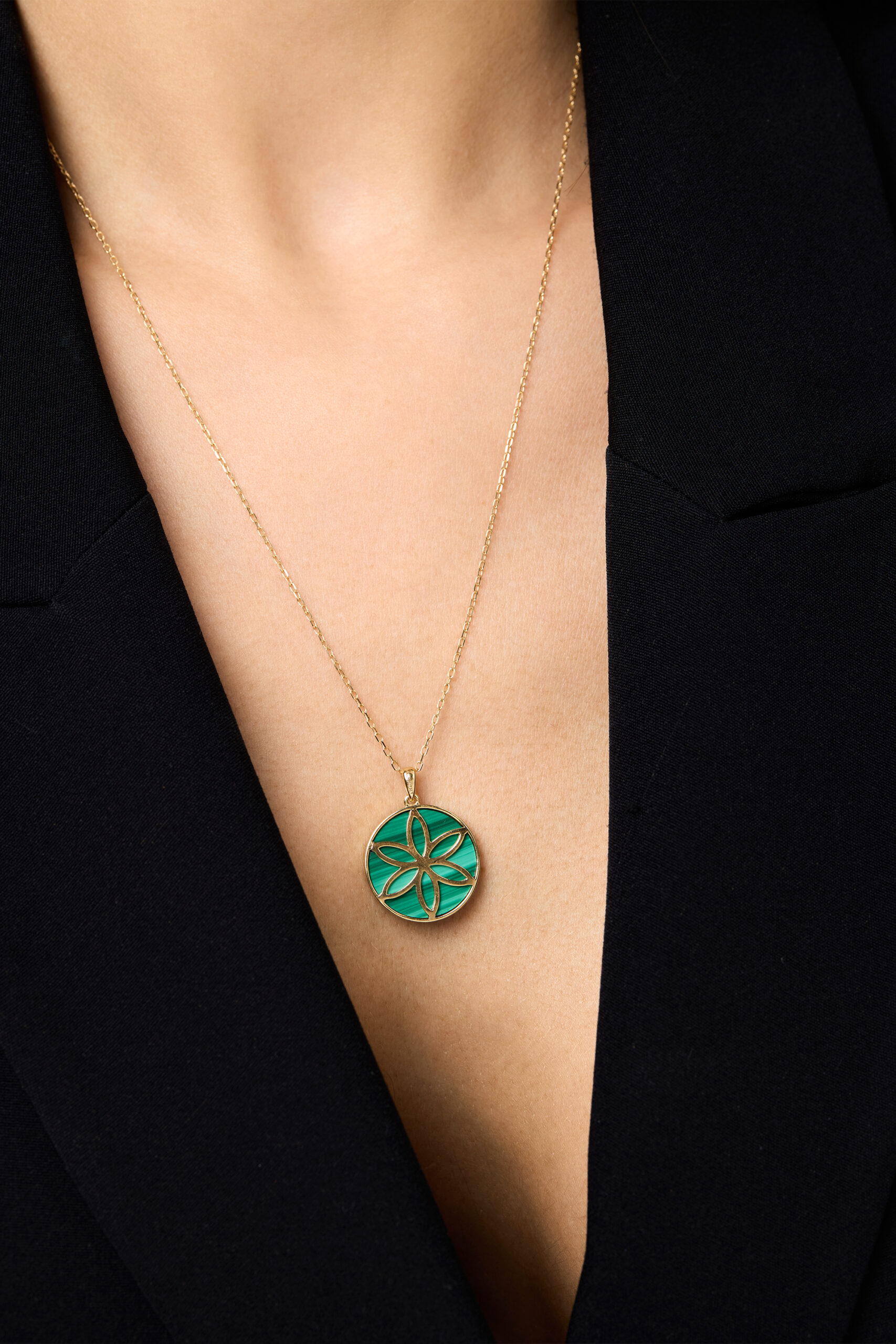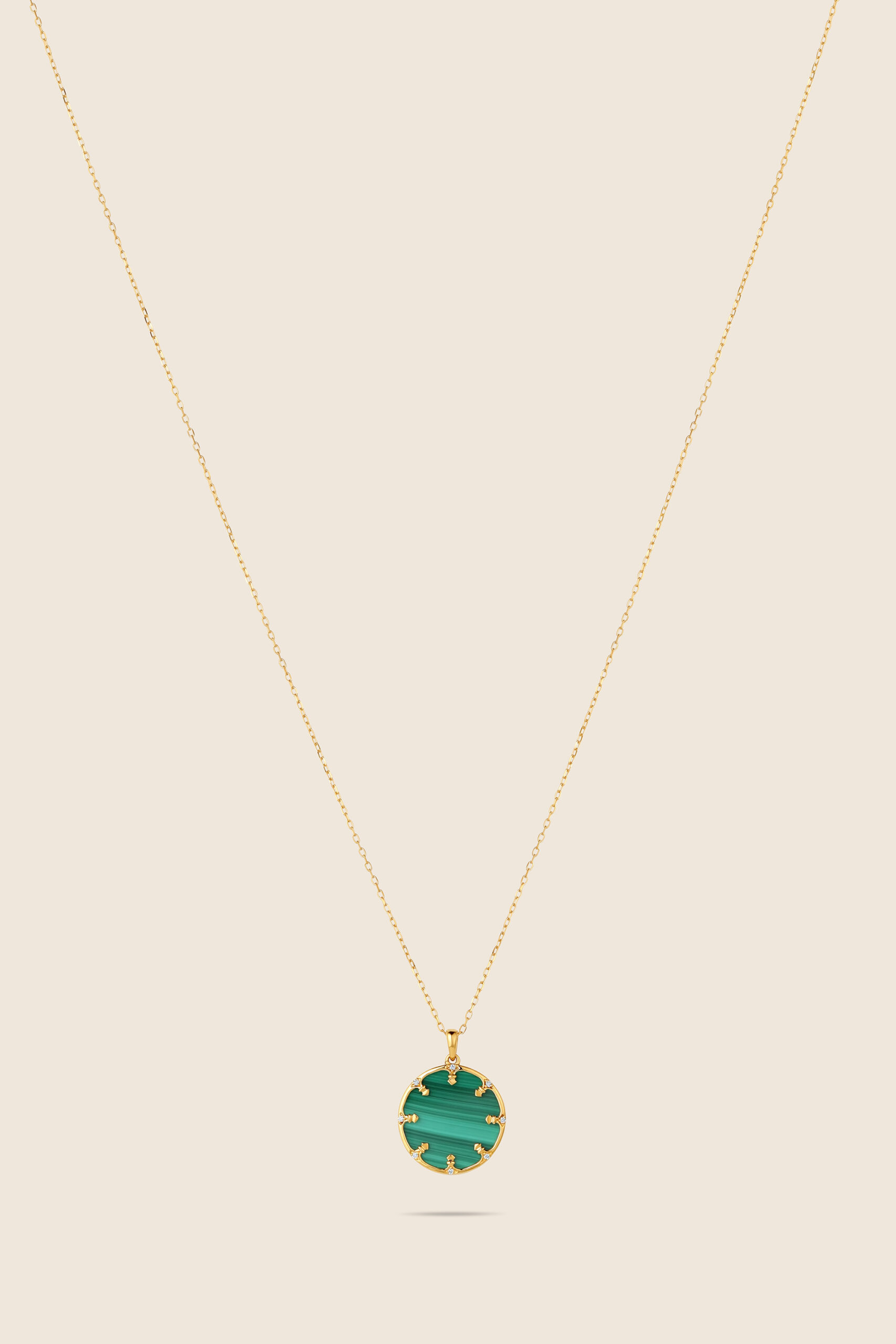 A circle of yellow gold cradles deep malachite, diamonds shimmering like sacred light an eternal motif of faith, unity, and strength