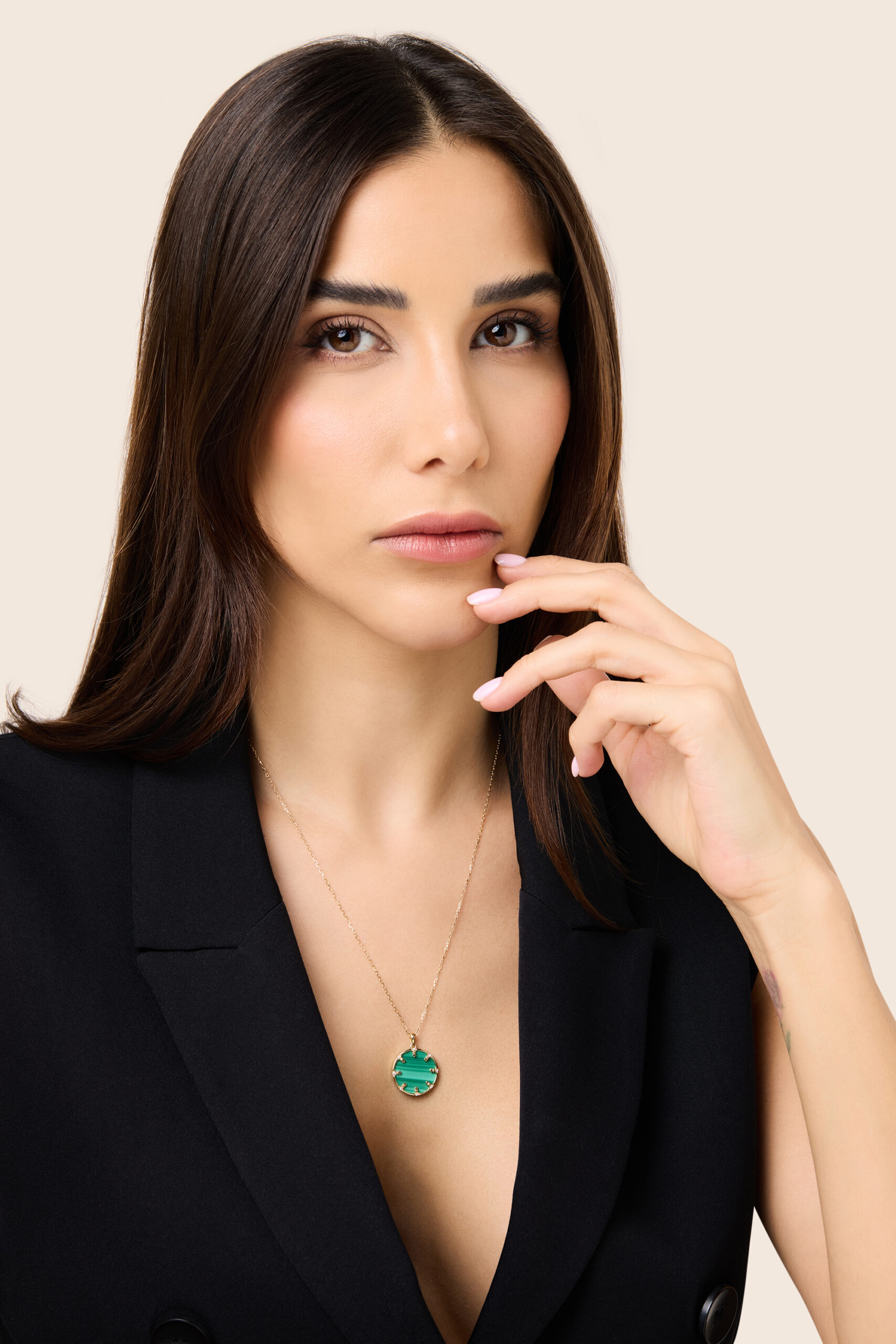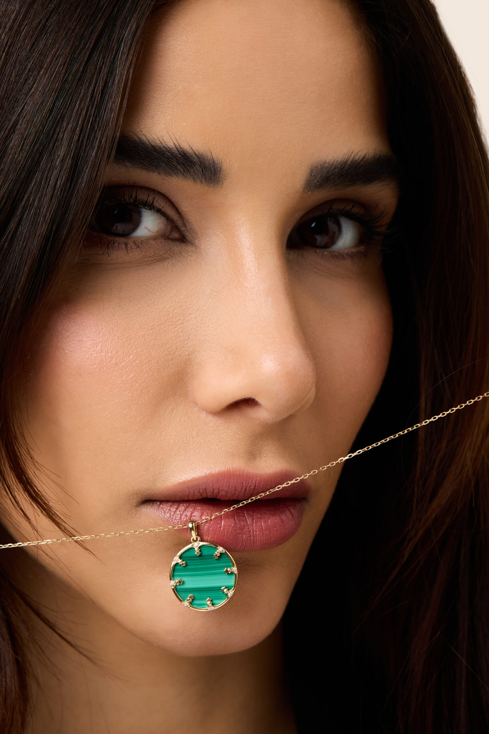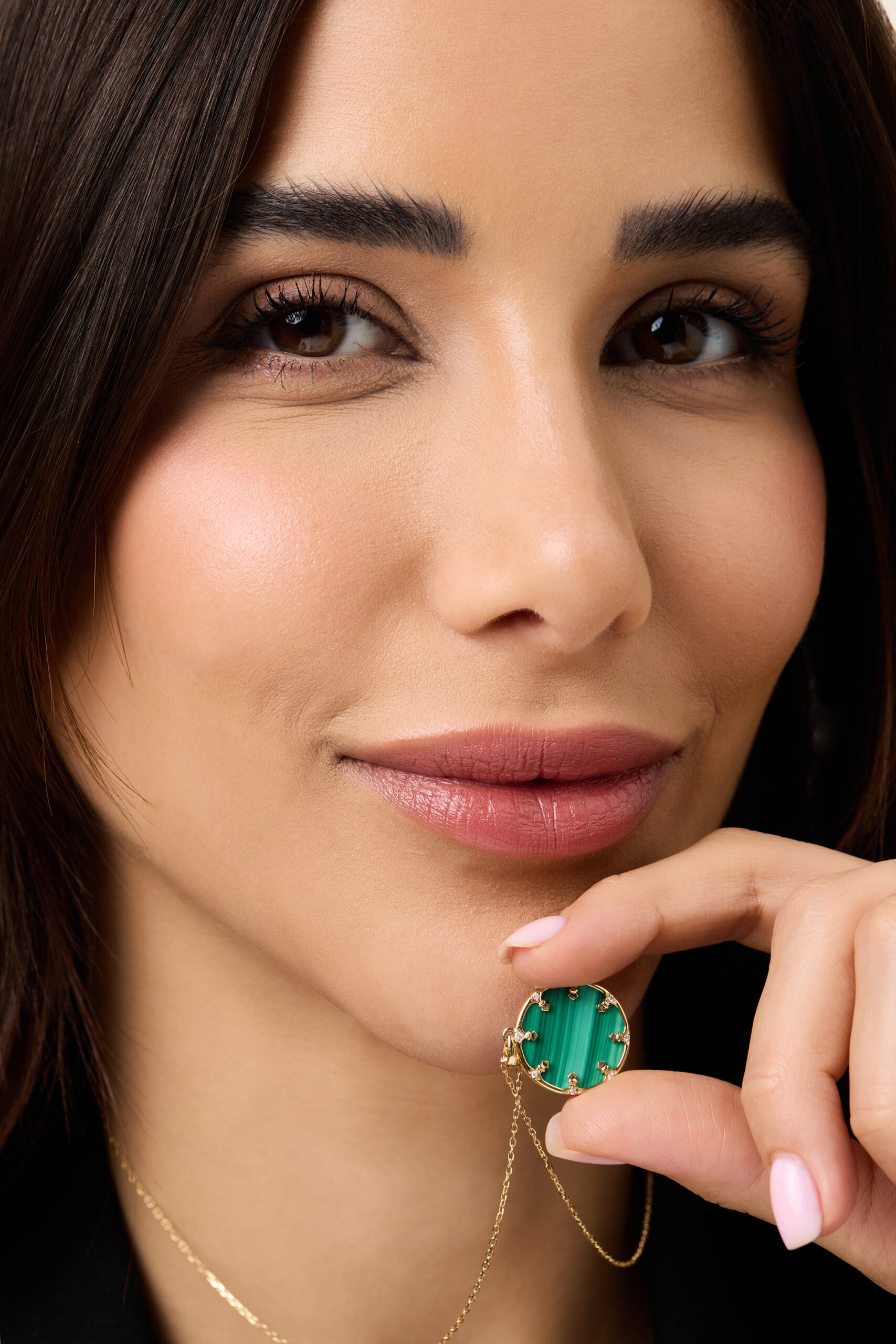A circle of yellow gold cradles deep malachite, diamonds shimmering like sacred light an eternal motif of faith, unity, and strength