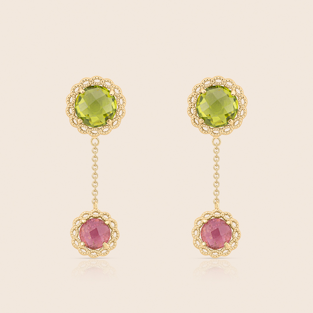 Chiara yellow gold two motive earring with peridot and amethyst