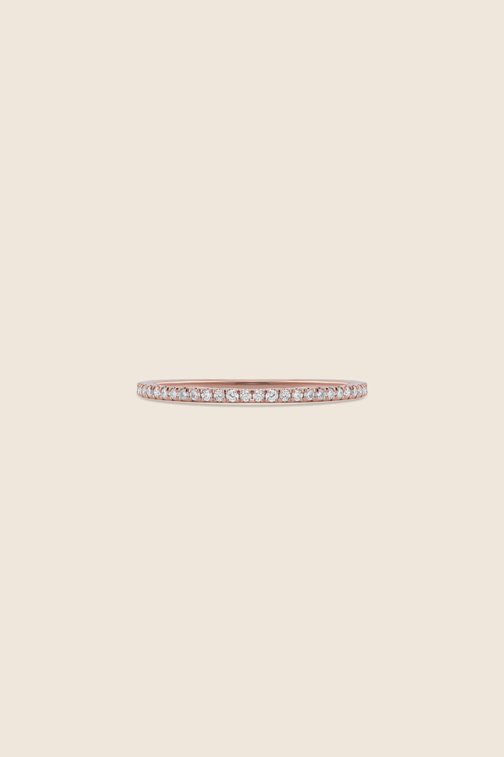 Rose gold band adorned with diamonds in four prong basket setting timeless elegance where warmth meets brilliance.