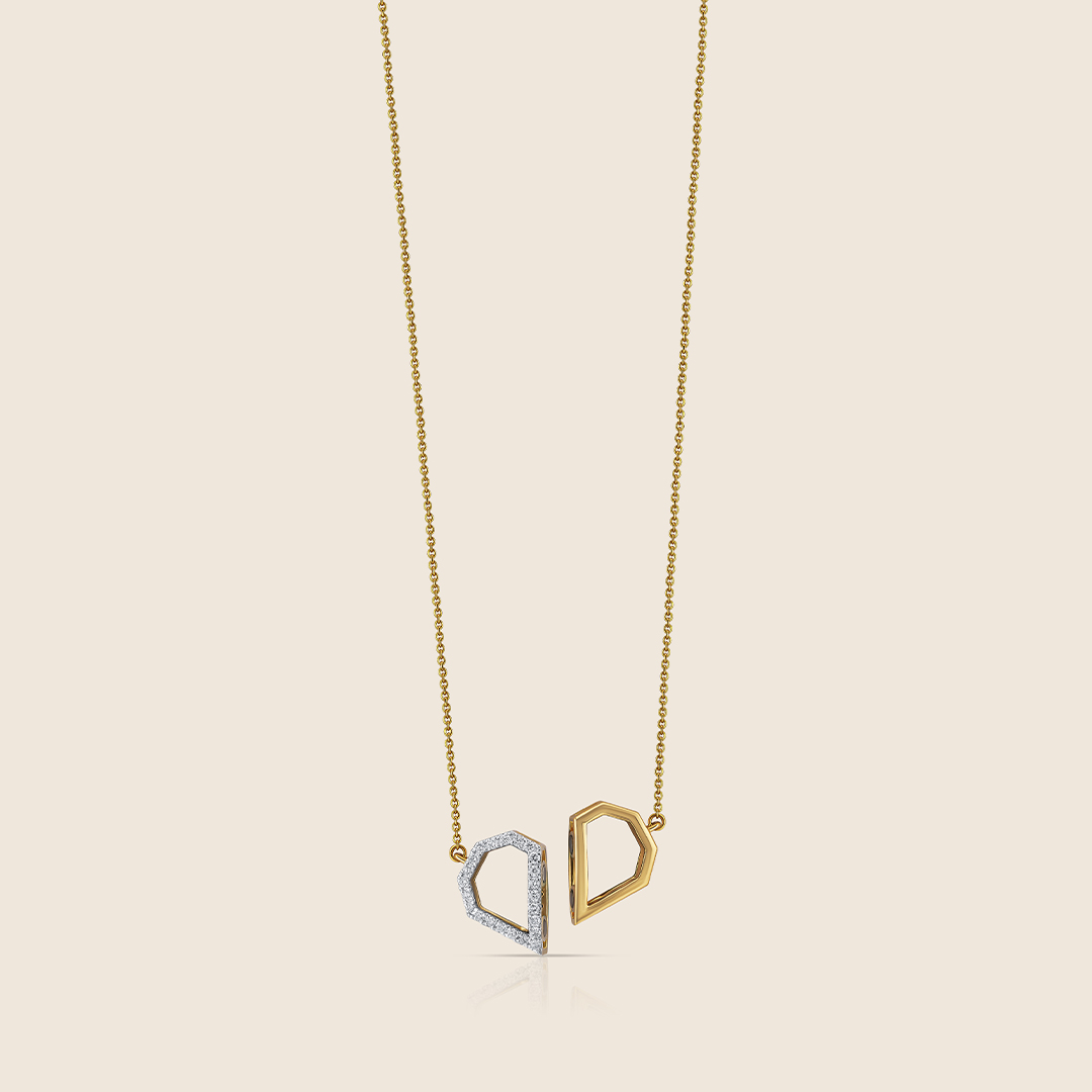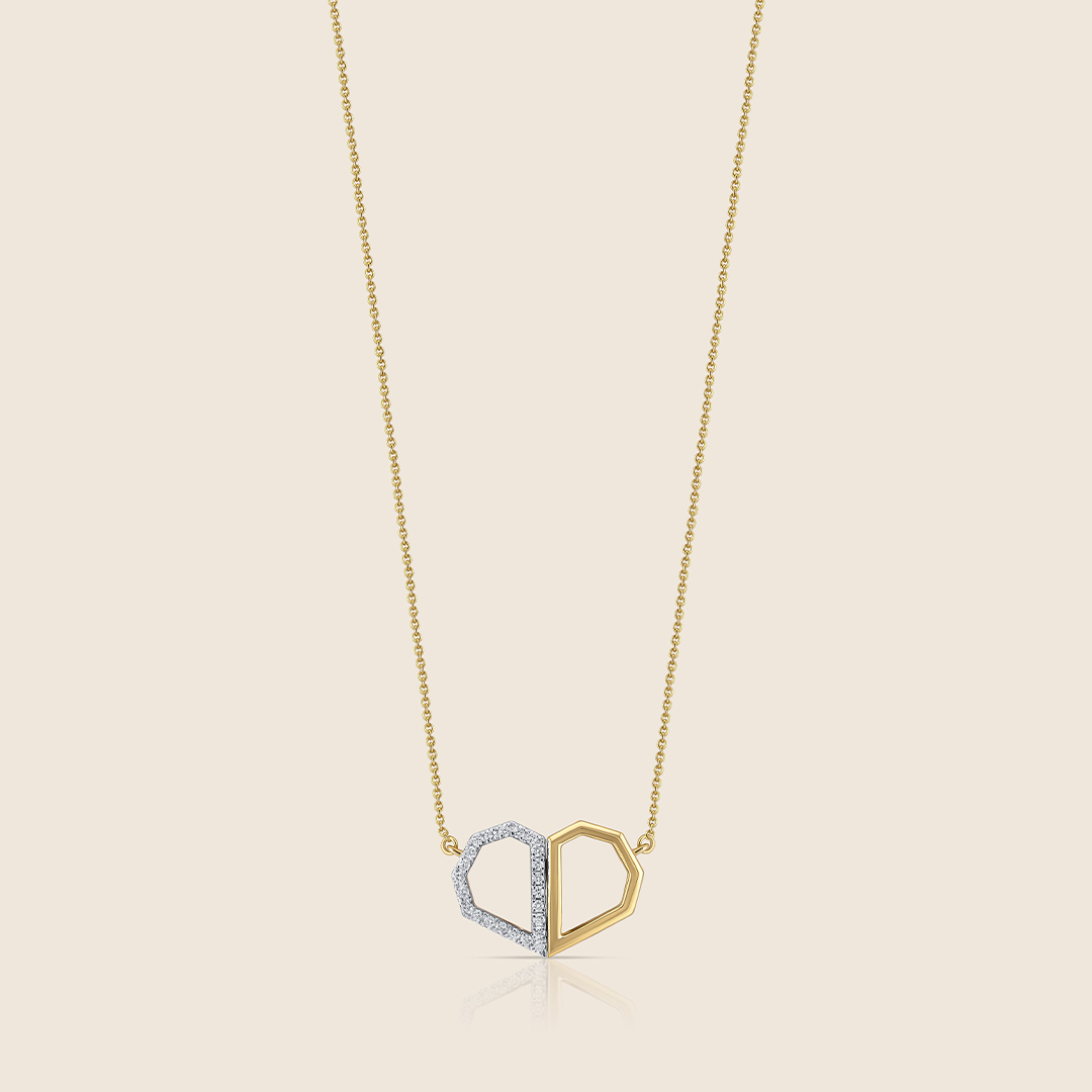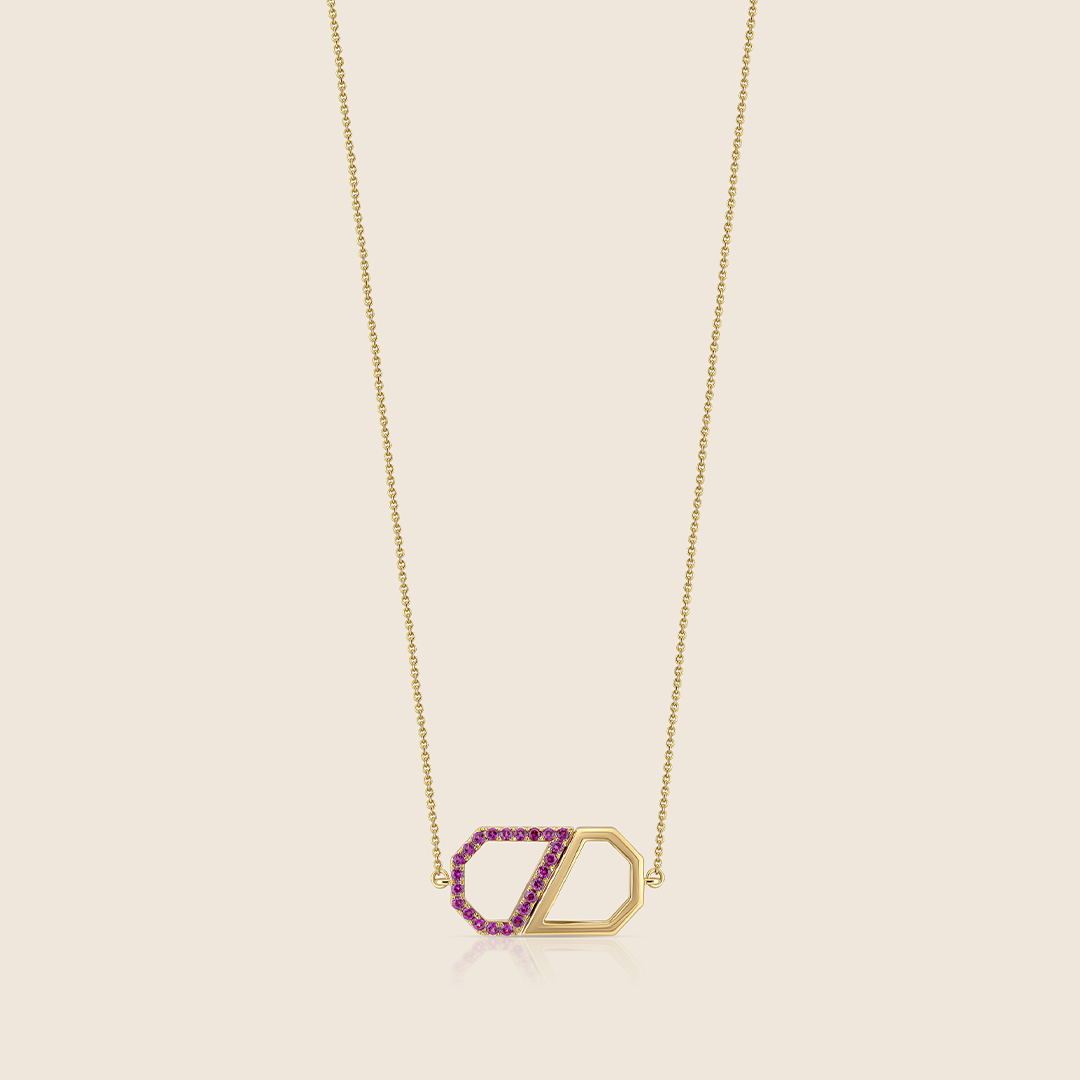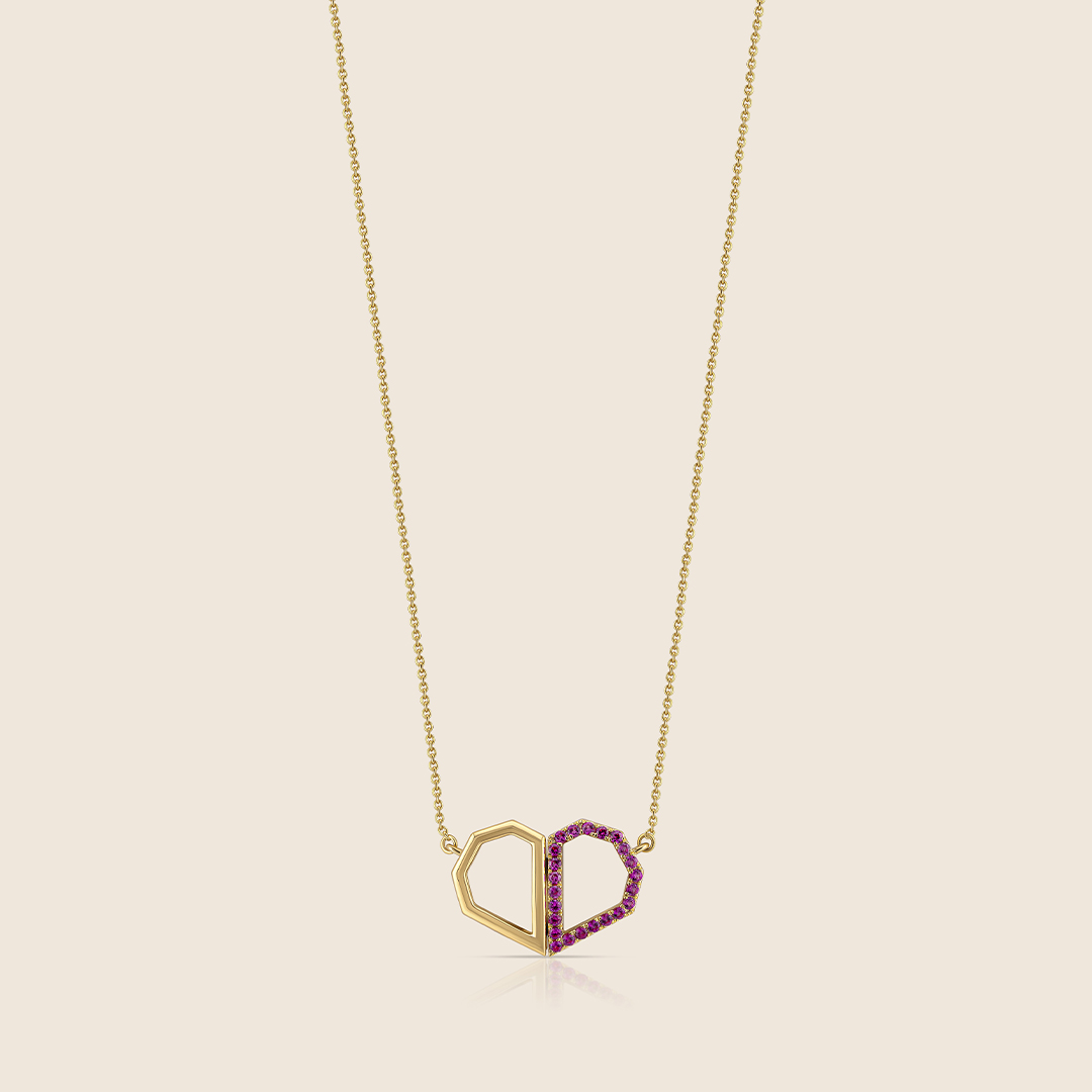 A yellow gold necklace of two entwined pieces, one with ruby, the other forming a heart when turned. Versatile and radiant, it transforms with every flip, celebrating love, passion, and cherished memories.