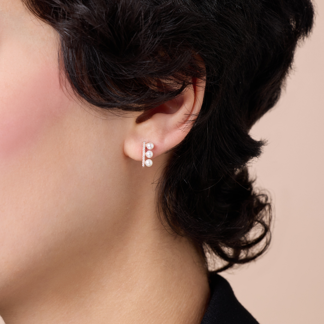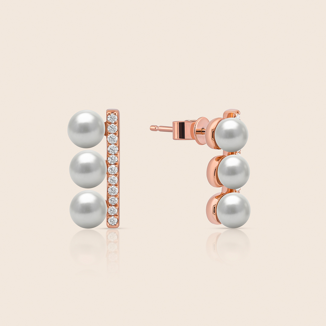 Shimmering with diamonds, a radiant line of rose gold gives way to five dangling pearls, forming an elegant cascade that mirrors the rhythm and grace of flowing waves