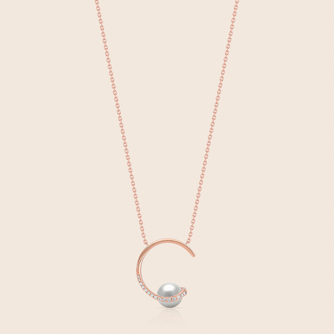 A radiant pearl suspended in a rose gold crescent lined with diamonds, reflecting celestial harmony, timeless elegance, and the serene strength of femininity.
