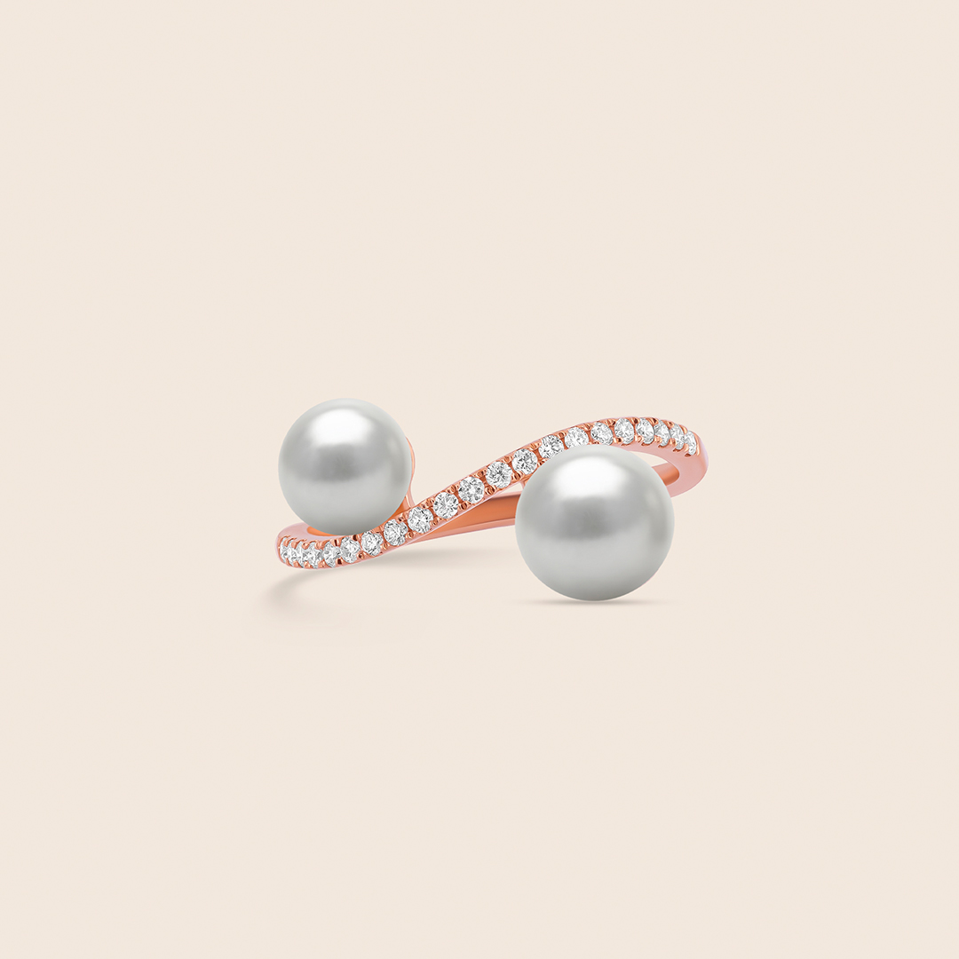 A graceful rose gold wave sparkles with diamonds, cradling twin pearls, evoking ocean rhythms, natural harmony, and the serene beauty of flowing elegance