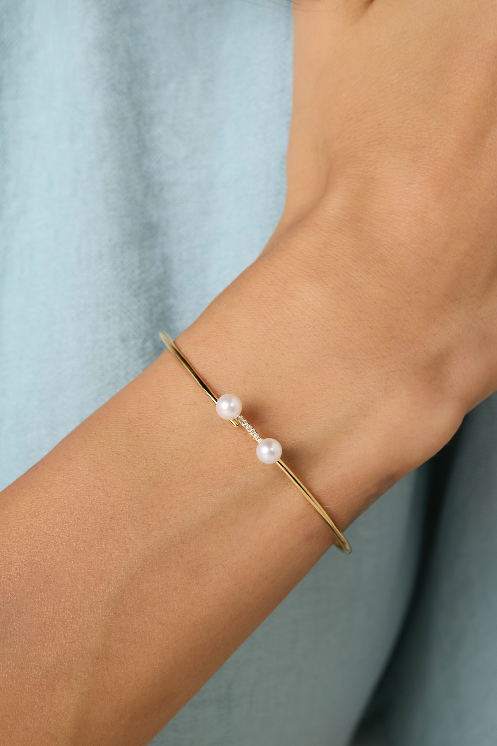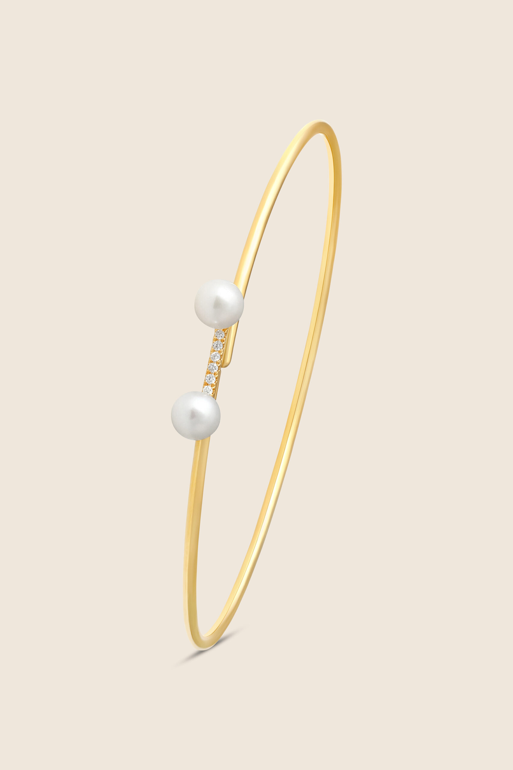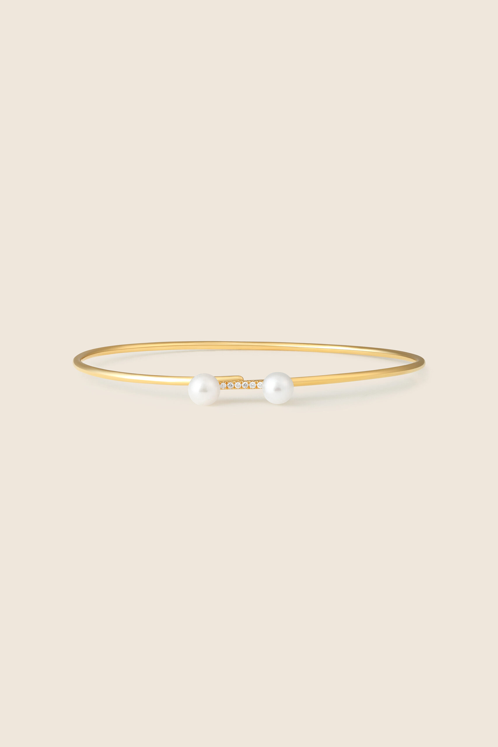 Crowned with luminous pearls at each end, the yellow gold bar is designed where simplicity meets elegance and beauty meets balance