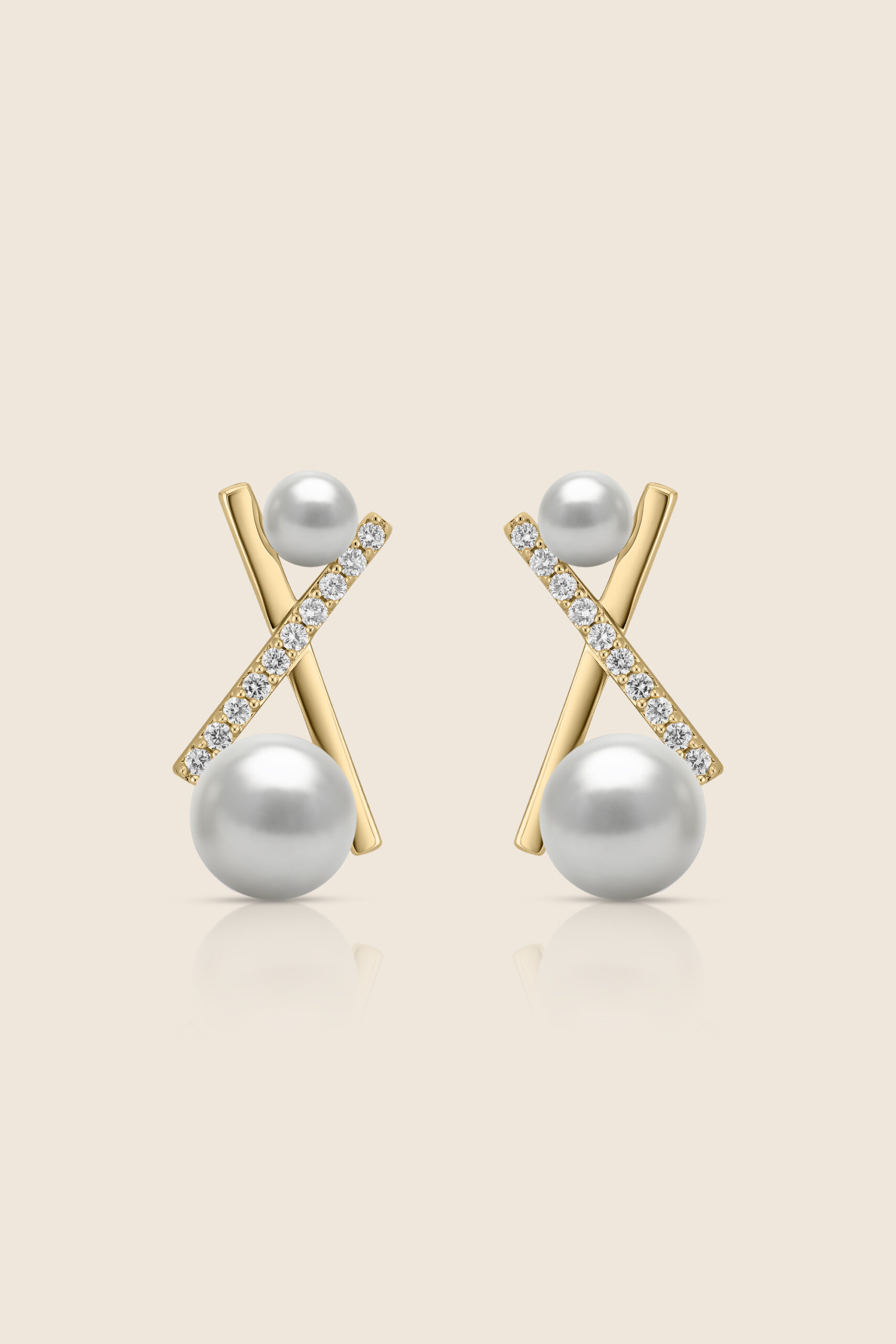 Adorned with pearls and set with diamonds, two yellow gold bars are crossed in harmony, reflecting balance, radiance, and timeless grace