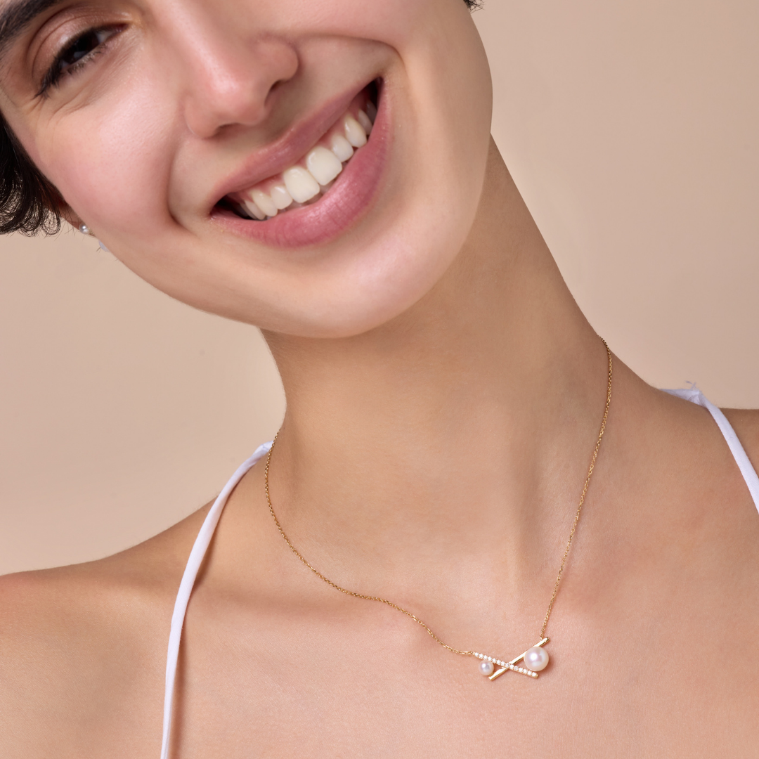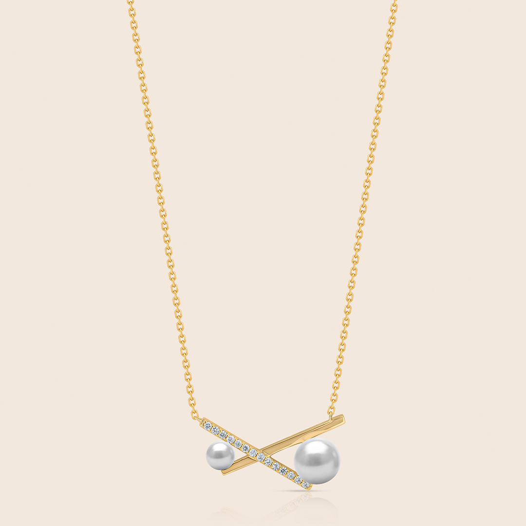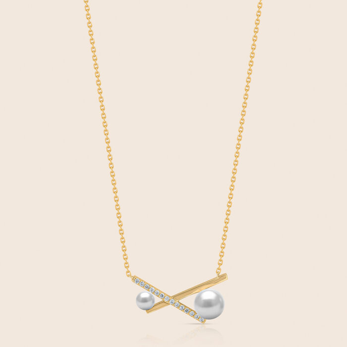 Adorned with pearls and set with diamonds, two yellow gold bars are crossed in harmony, reflecting balance, radiance, and timeless grace