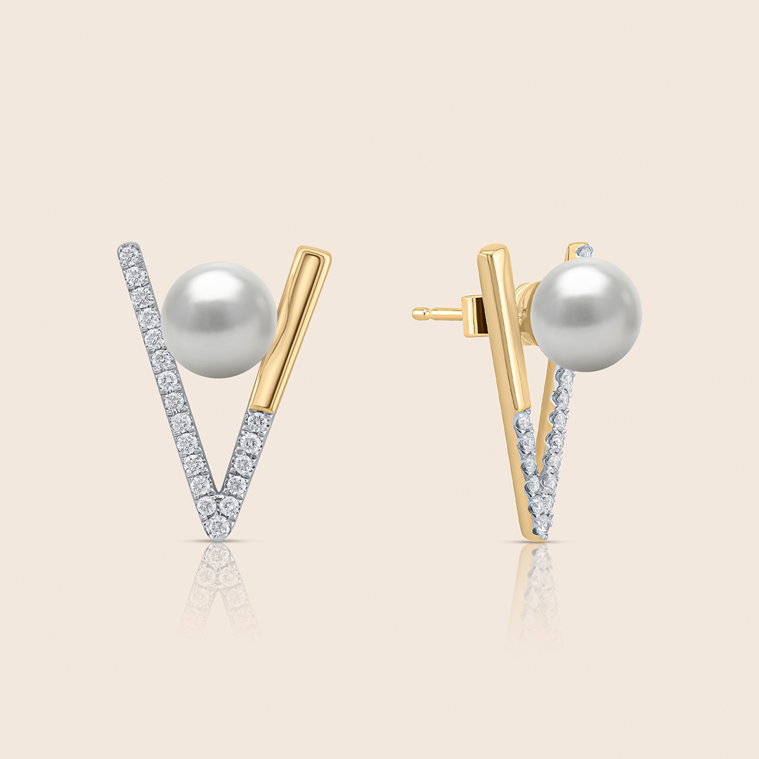 A bold geometric V design in yellow gold, accented with shimmering diamonds and a radiant center pearl, reflecting modern elegance and structured sophistication.