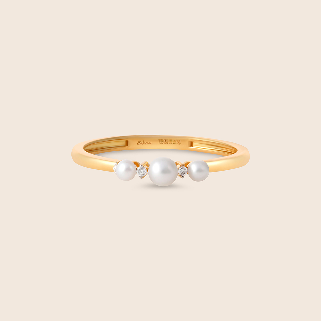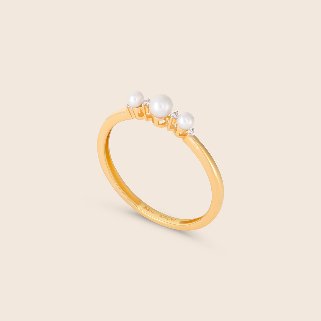 Sparkling with diamonds and accented by three luminous pearls, the yellow gold ring is seen where timeless elegance meets the gentle beauty of nature