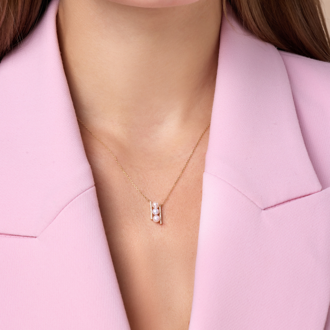 A refined vertical pendant in yellow gold, adorned with sparkling diamonds and three gracefully stacked pearls, symbolizing harmony, elegance, and modern sophistication.