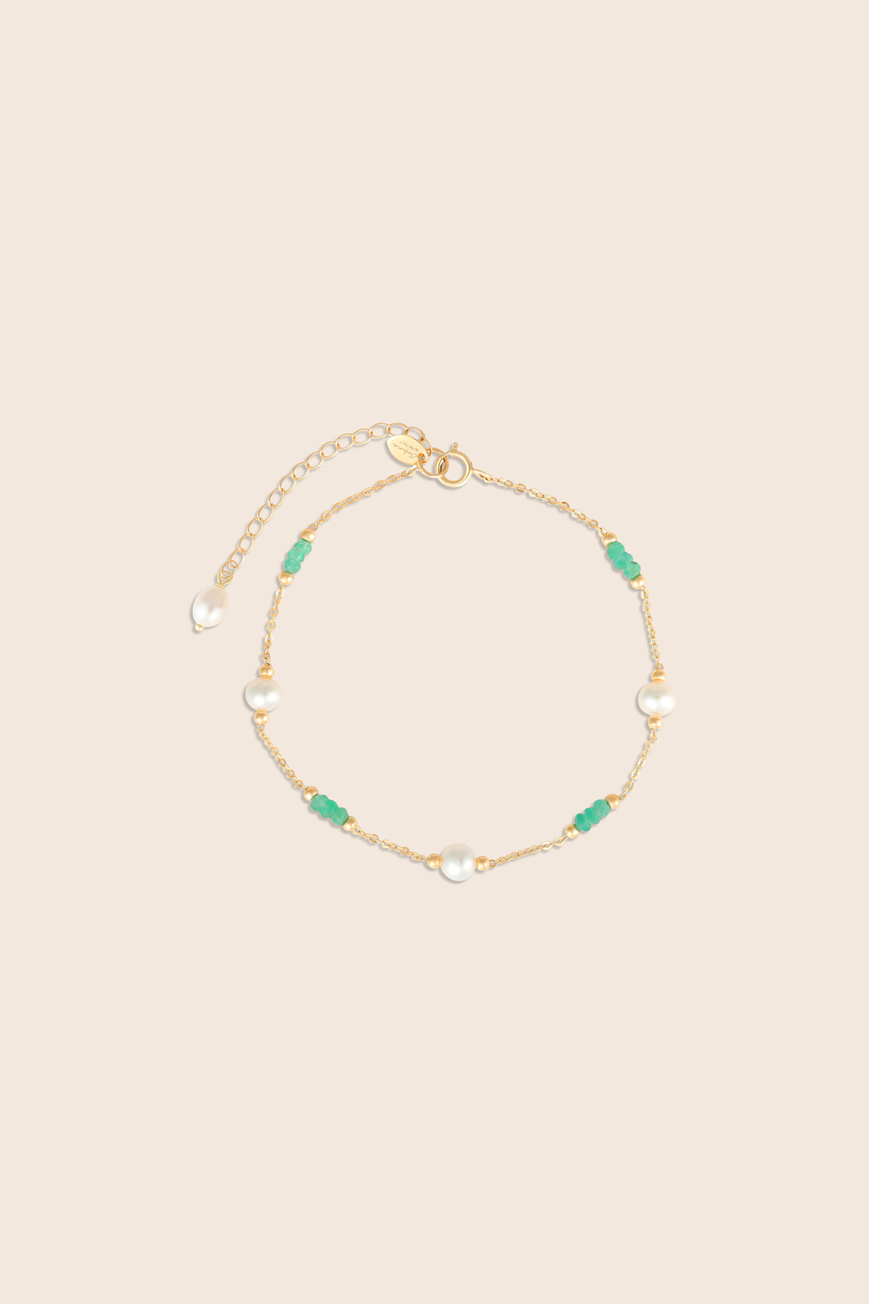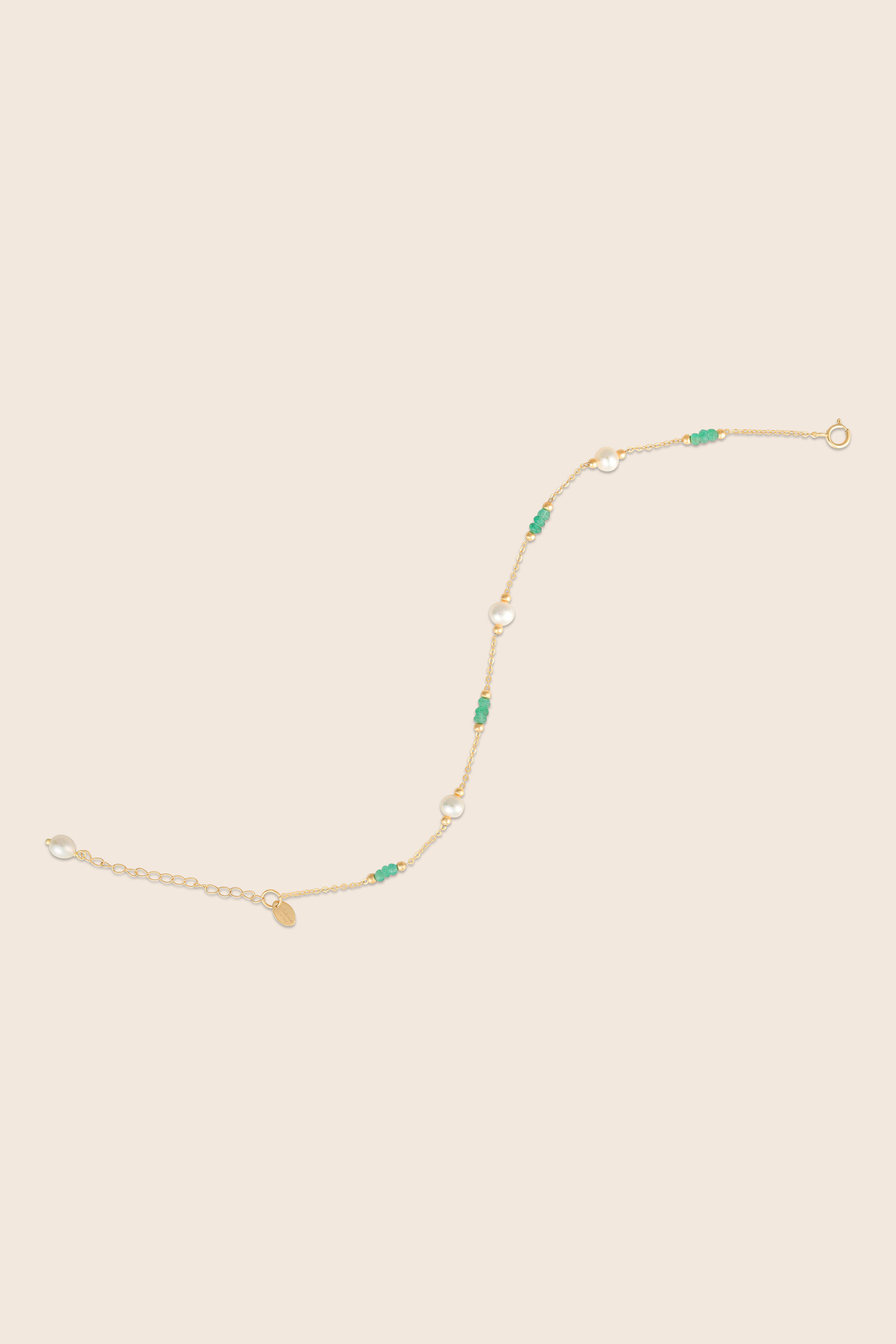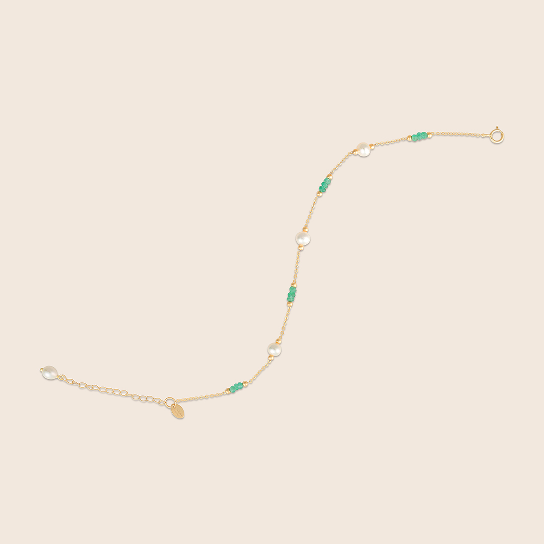 Lavita yellow gold pearl bracelet with two consecutive emerald beads