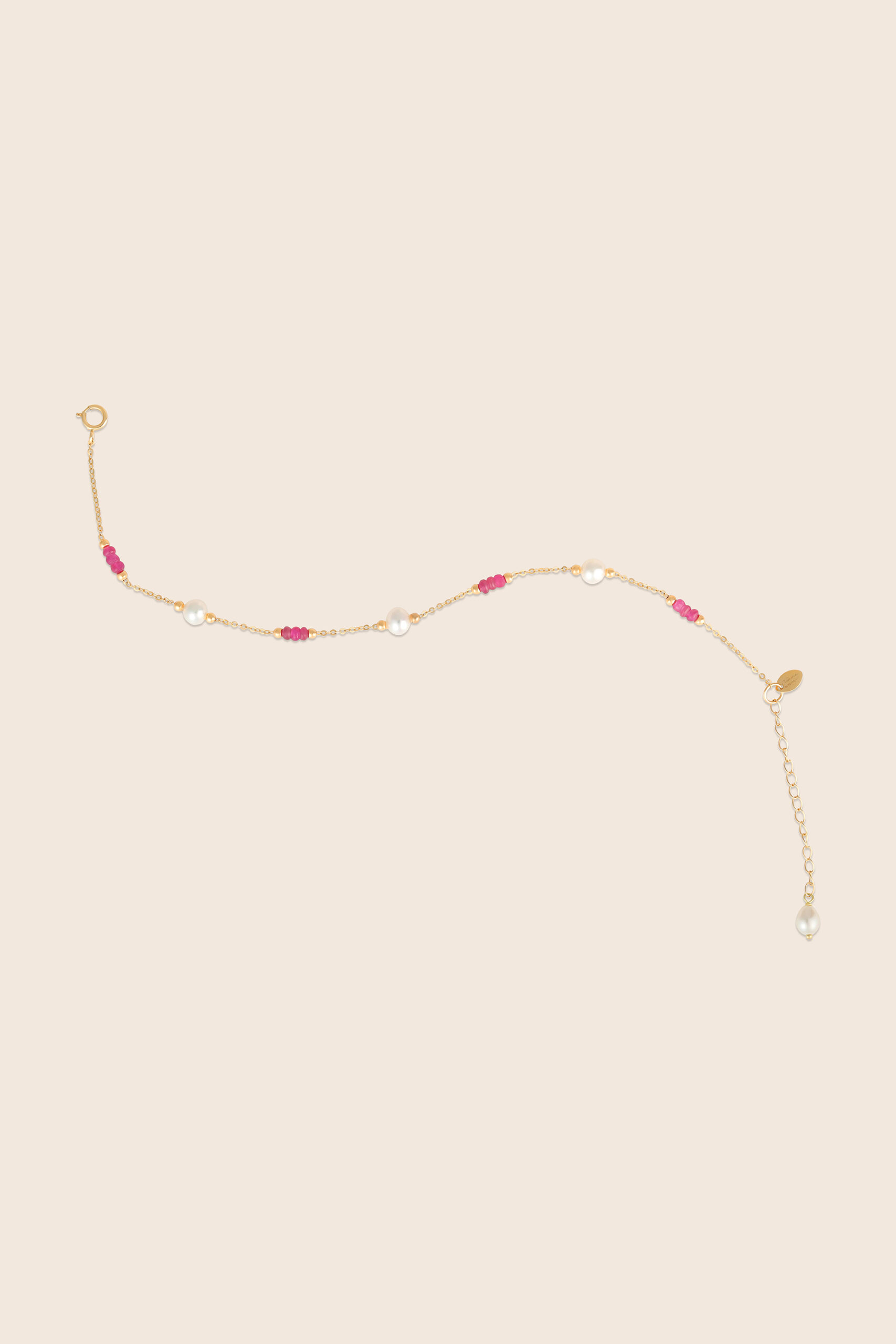 Lavita yellow gold pearl bracelet with two consecutive ruby beads