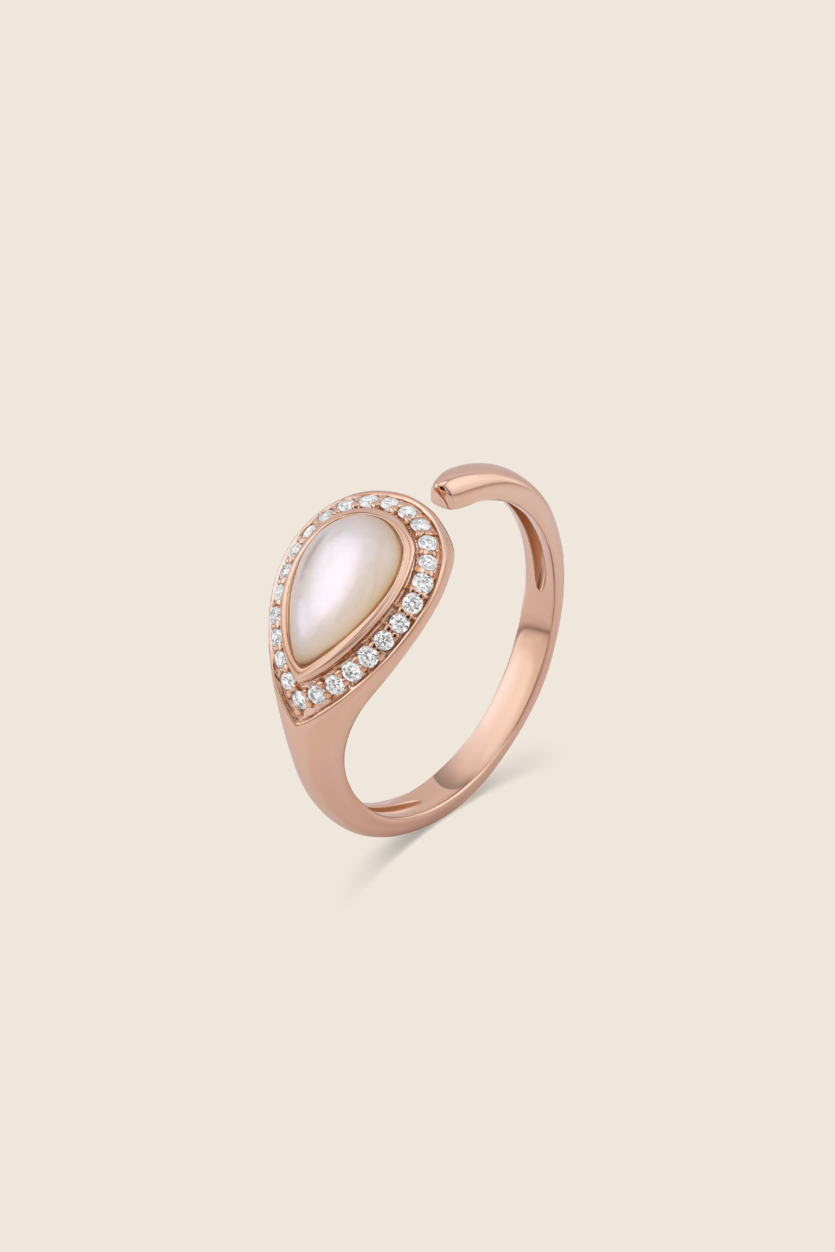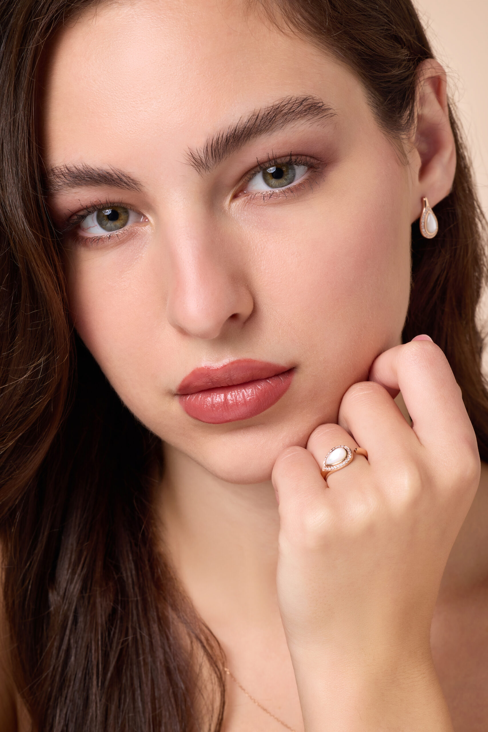 Soft mother of pearl drops accent radiant diamonds in rose gold blending fluid grace, feminine charm, and the delicate beauty of celestial light.