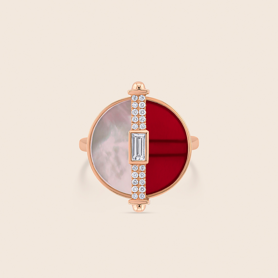 A blushing rhodonite centerpiece embraced by rose gold and shimmering diamonds symbolizing compassion, resilience, and the timeless beauty of heartfelt grace.