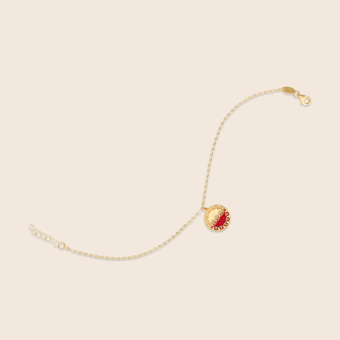 Embraced by a band of yellow gold, vivid dangling ruby and luminous enamel are set with delicate detailing, where elegance meets artistry and strength