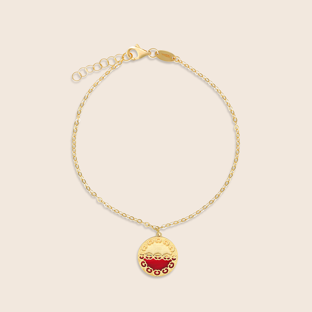 Embraced by a band of yellow gold, vivid dangling ruby and luminous enamel are set with delicate detailing, where elegance meets artistry and strength