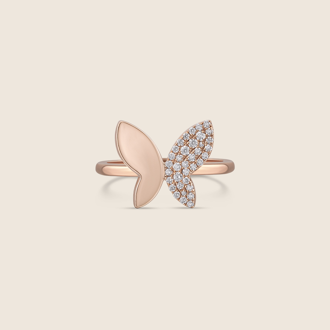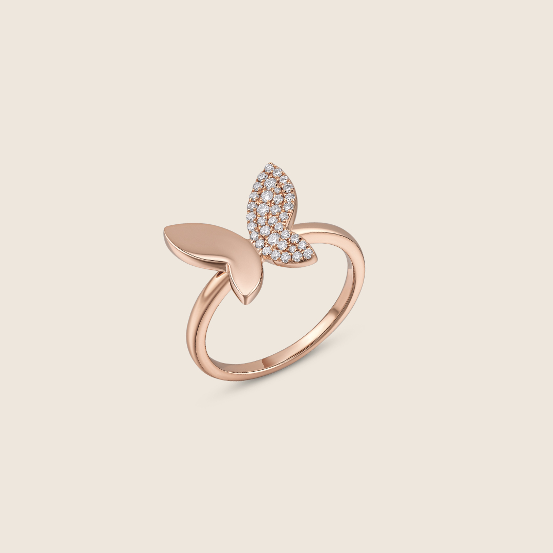 Inspired by the movement of butterfly wings, this 18K rose gold ring features brilliant diamonds in a graceful, flowing design