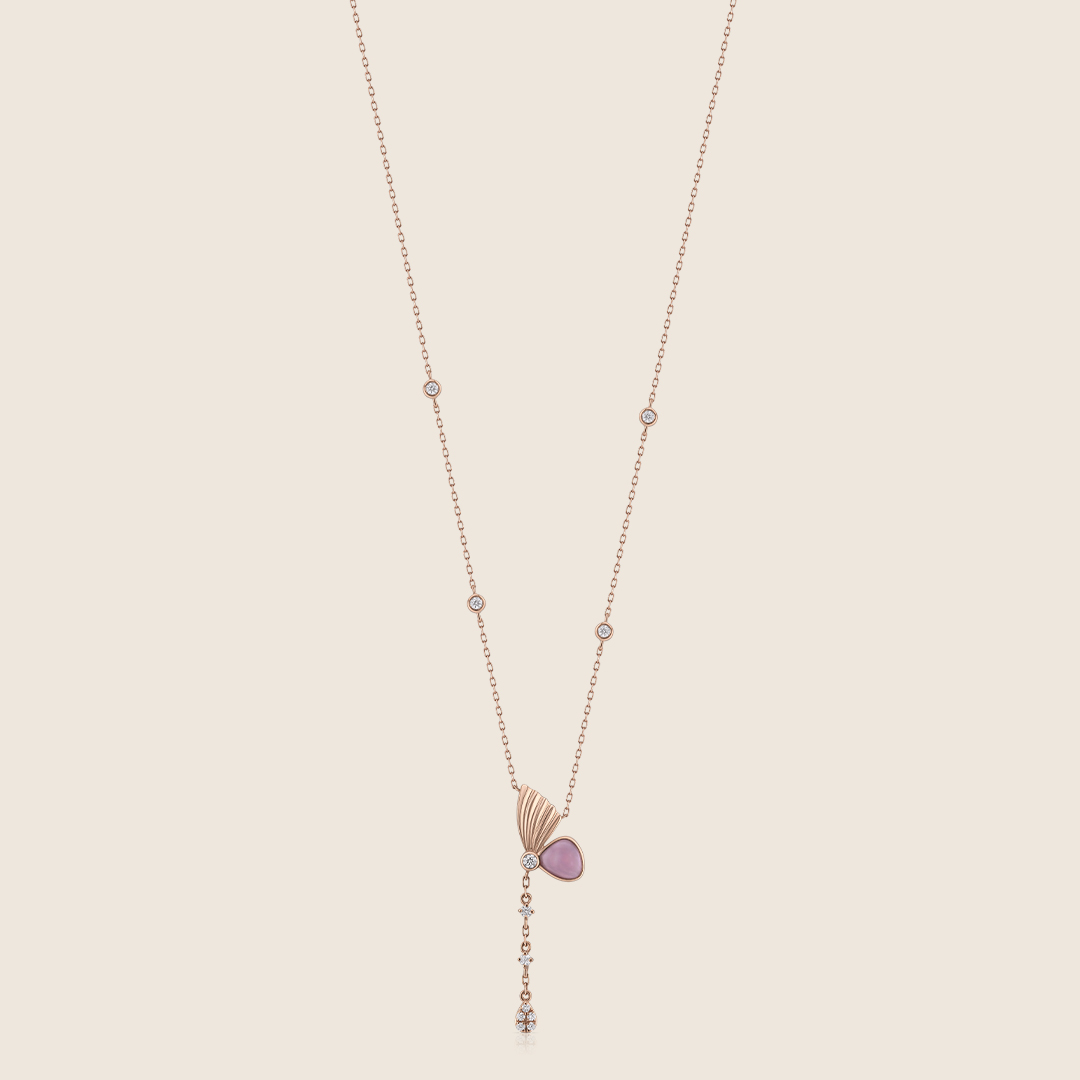 A delicate half-butterfly pendant crafted in 18K rose gold, adorned with sparkling diamonds and luminous mother-of-pearl. A graceful symbol of beauty and transformation.