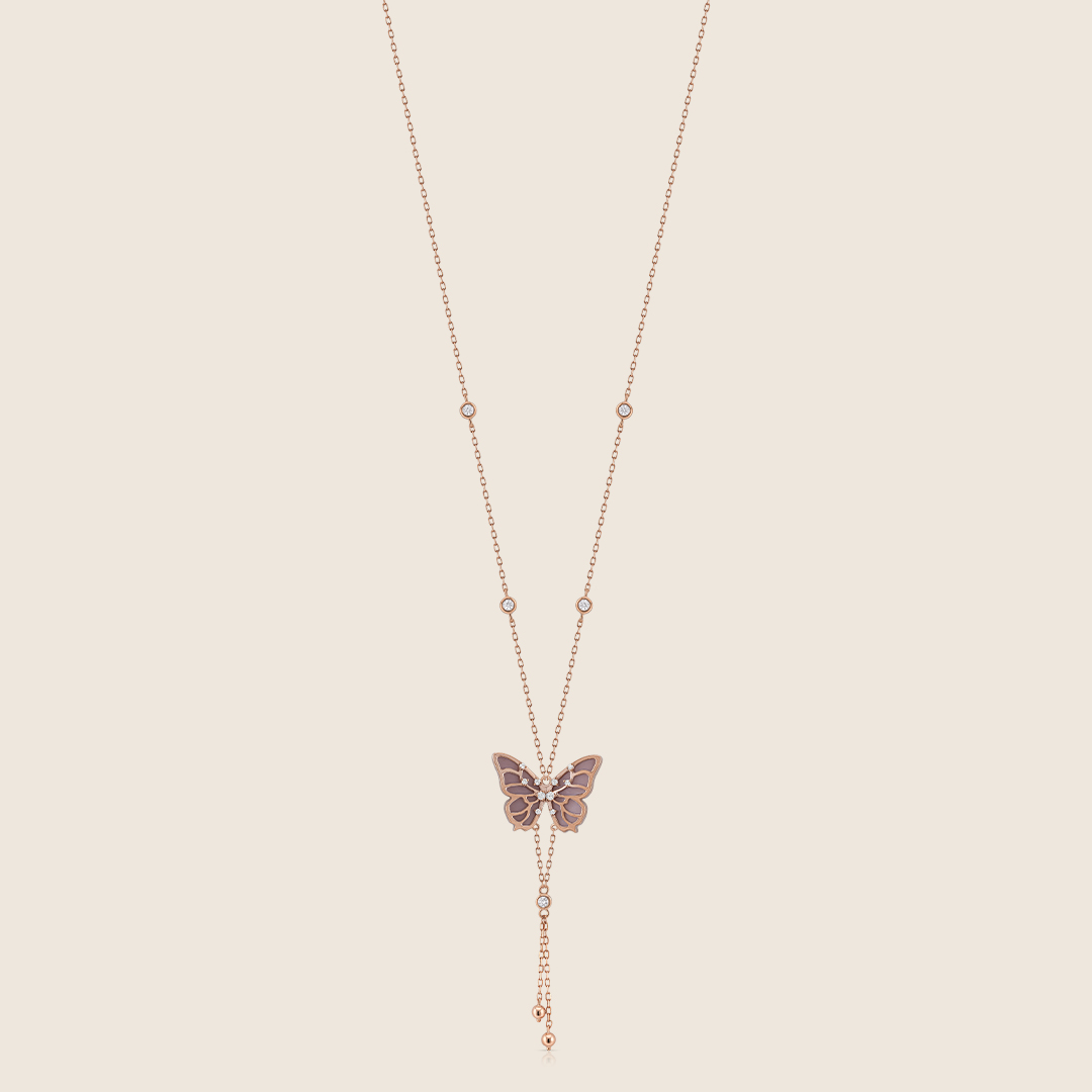A refined butterfly pendant featuring luminous Mother of Pearl wings framed with natural diamonds. Crafted in 18K gold, this piece reflects elegance, softness, and timeless beauty