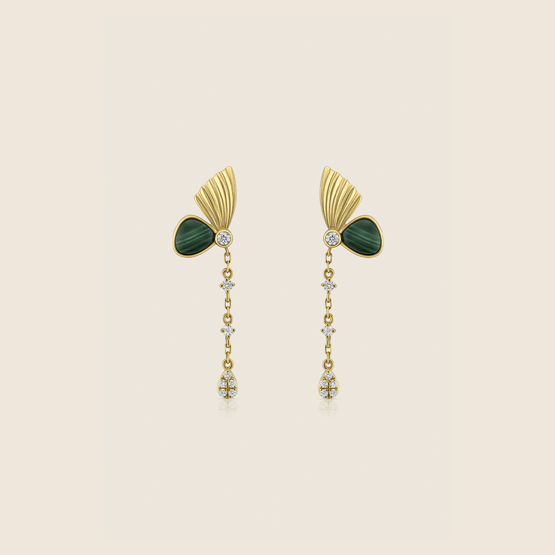 Yellow gold earrings glow softly with malachite and a diamond, like wings catching dawn light. Luminous and fluid, they carry a sense of gentleness, quiet lift, and beauty shaped by movement.
