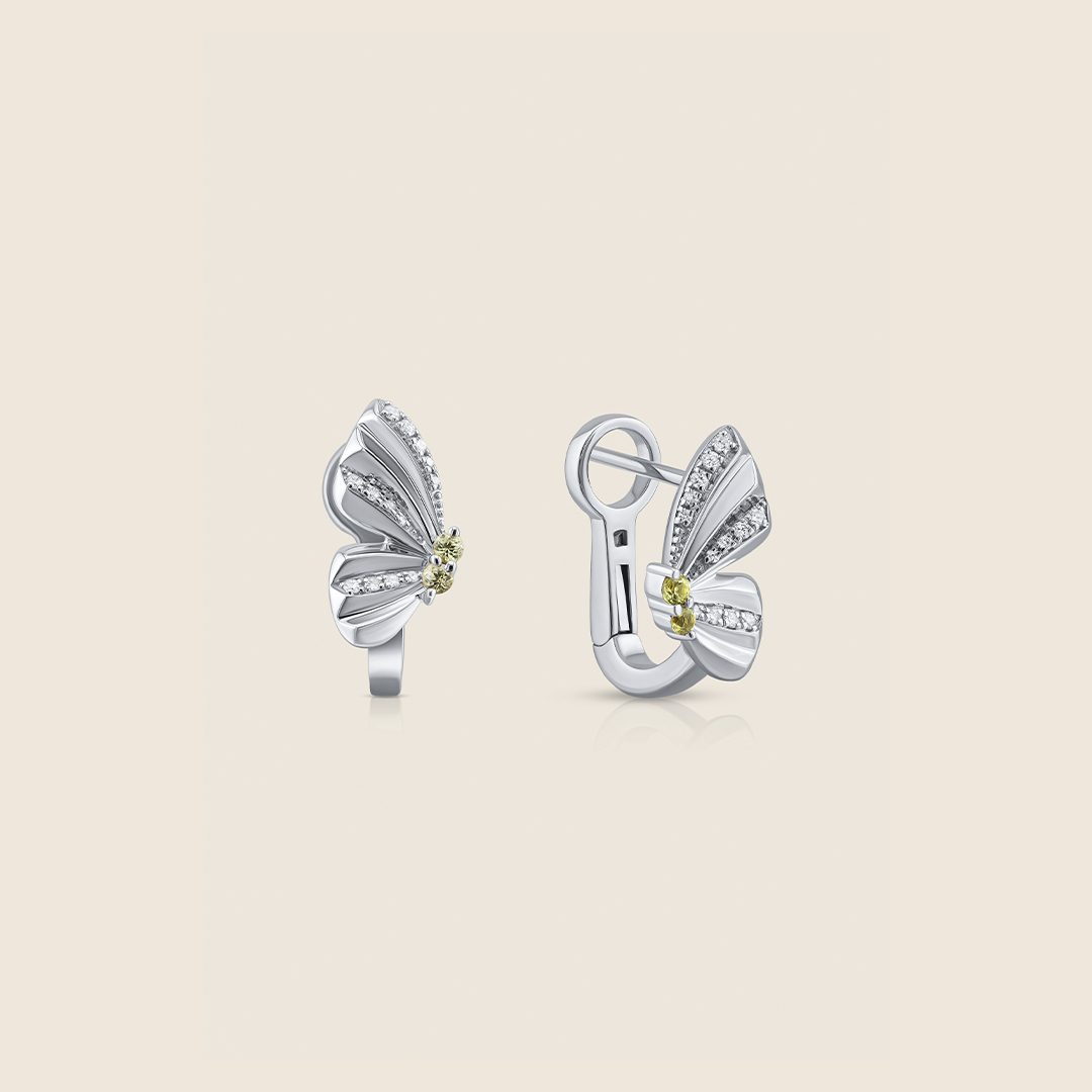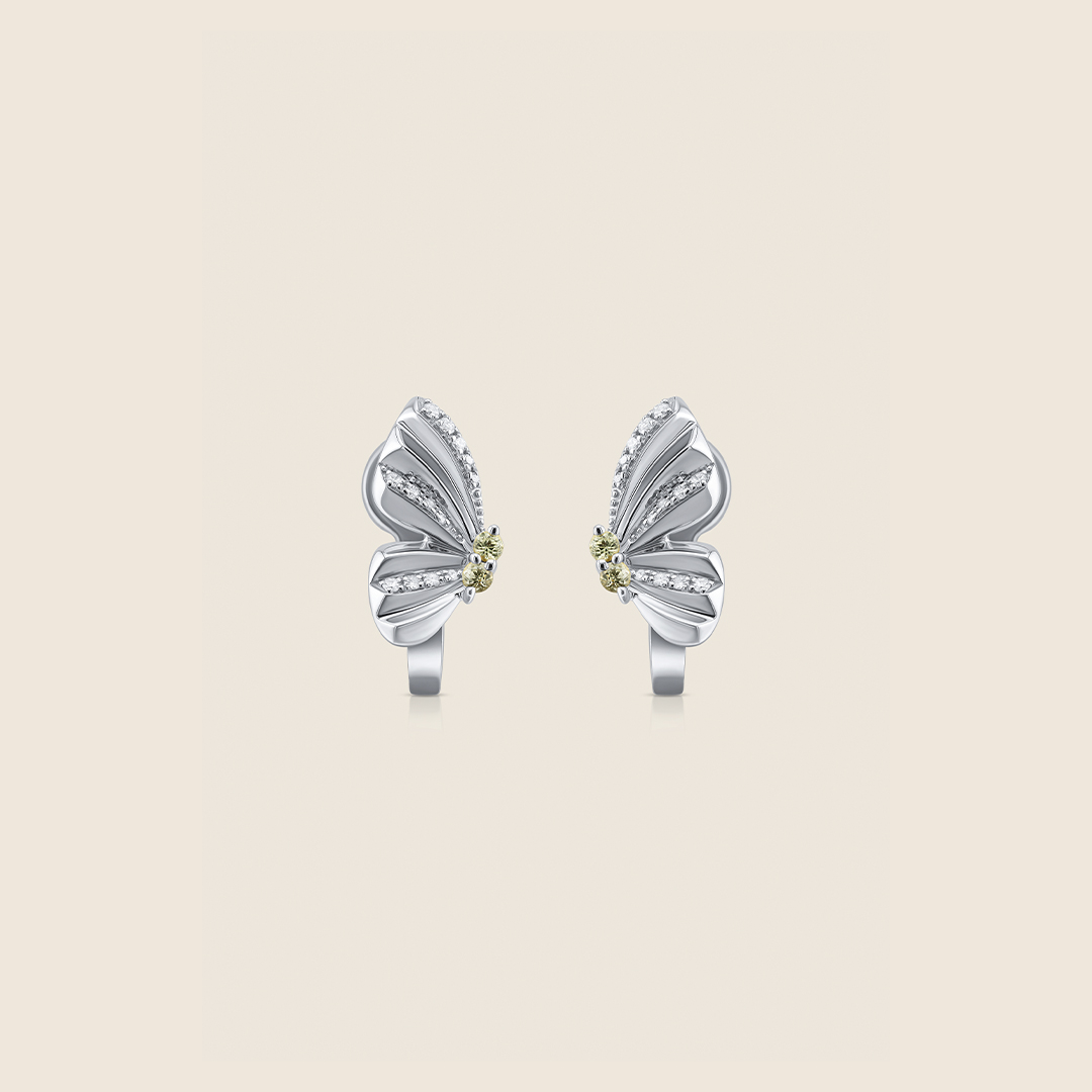 White gold huggies shaped by diamond light curve like delicate wings, holding movement and grace. They rest close yet feel ready to lift, reflecting freedom, softness, and the quiet courage to rise.